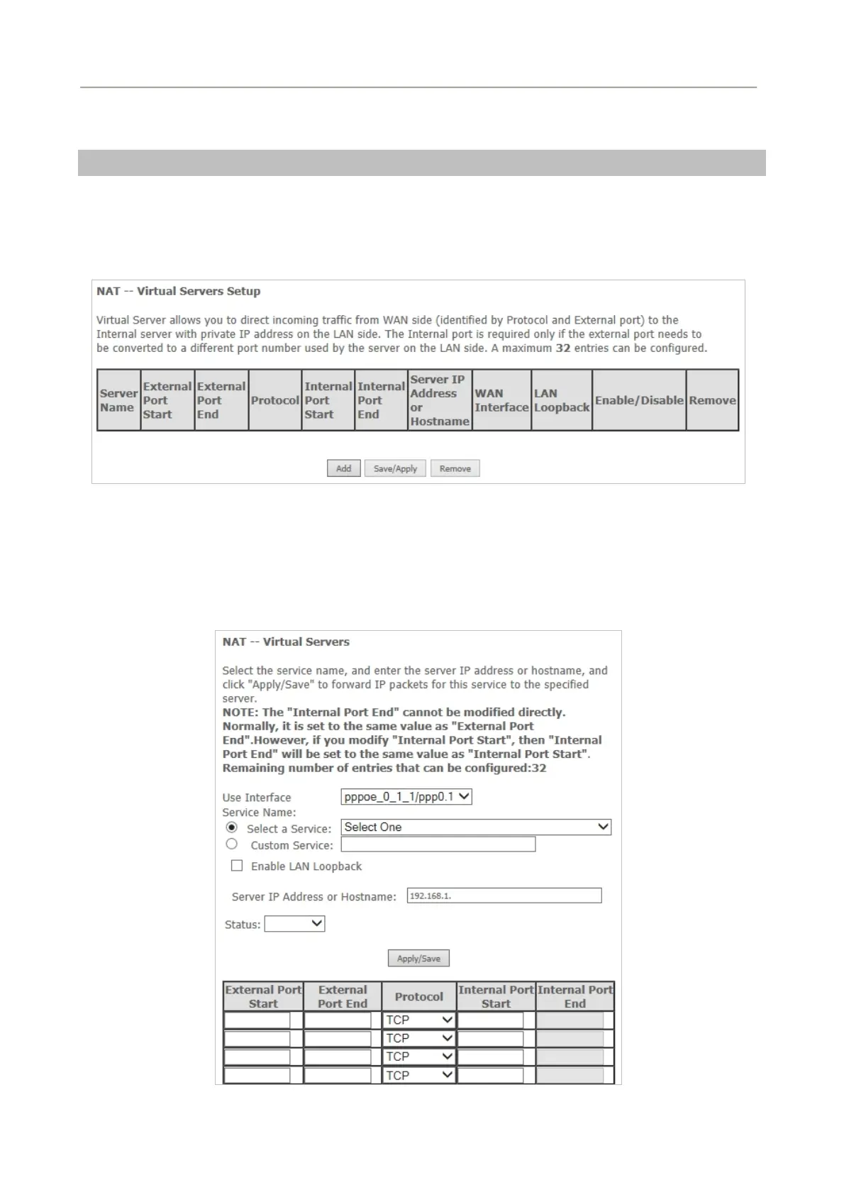 On this page, you are allowed to add or remove a virtual server entry. To add a virtual server, do as