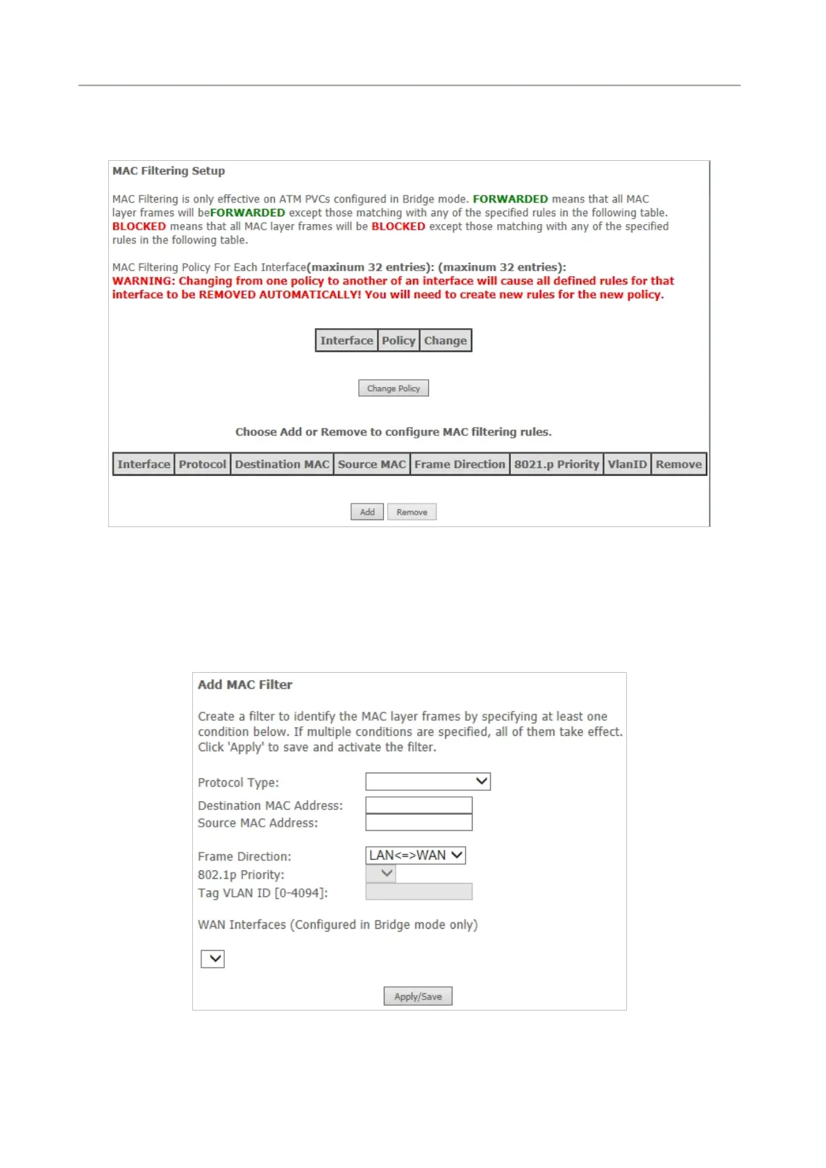 On this page, you can add or remove the MAC filtering rule. You may change the MAC filtering policy from