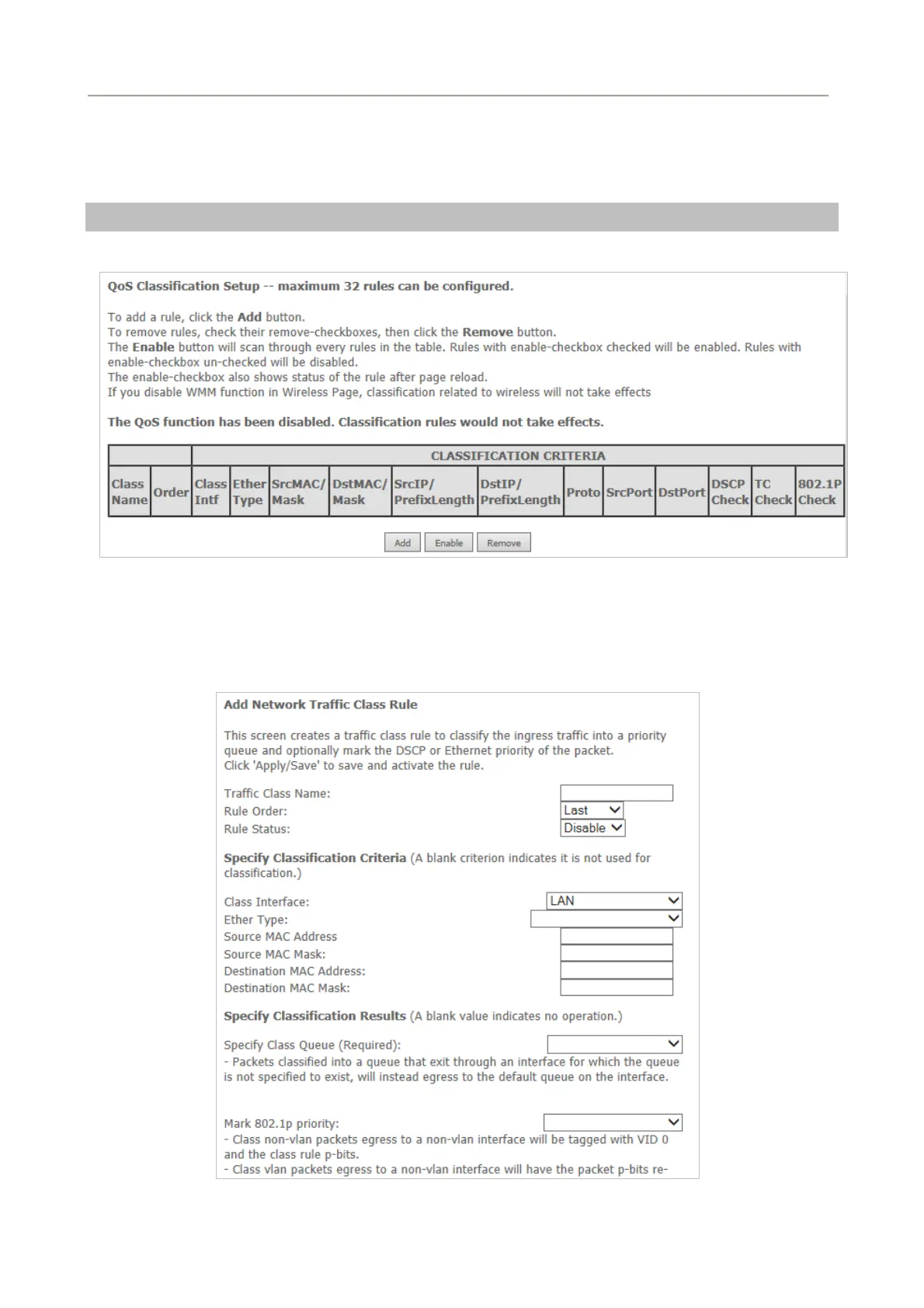 Choose Advanced Setup > Quality of Service > QoS Classification and the following page appears.