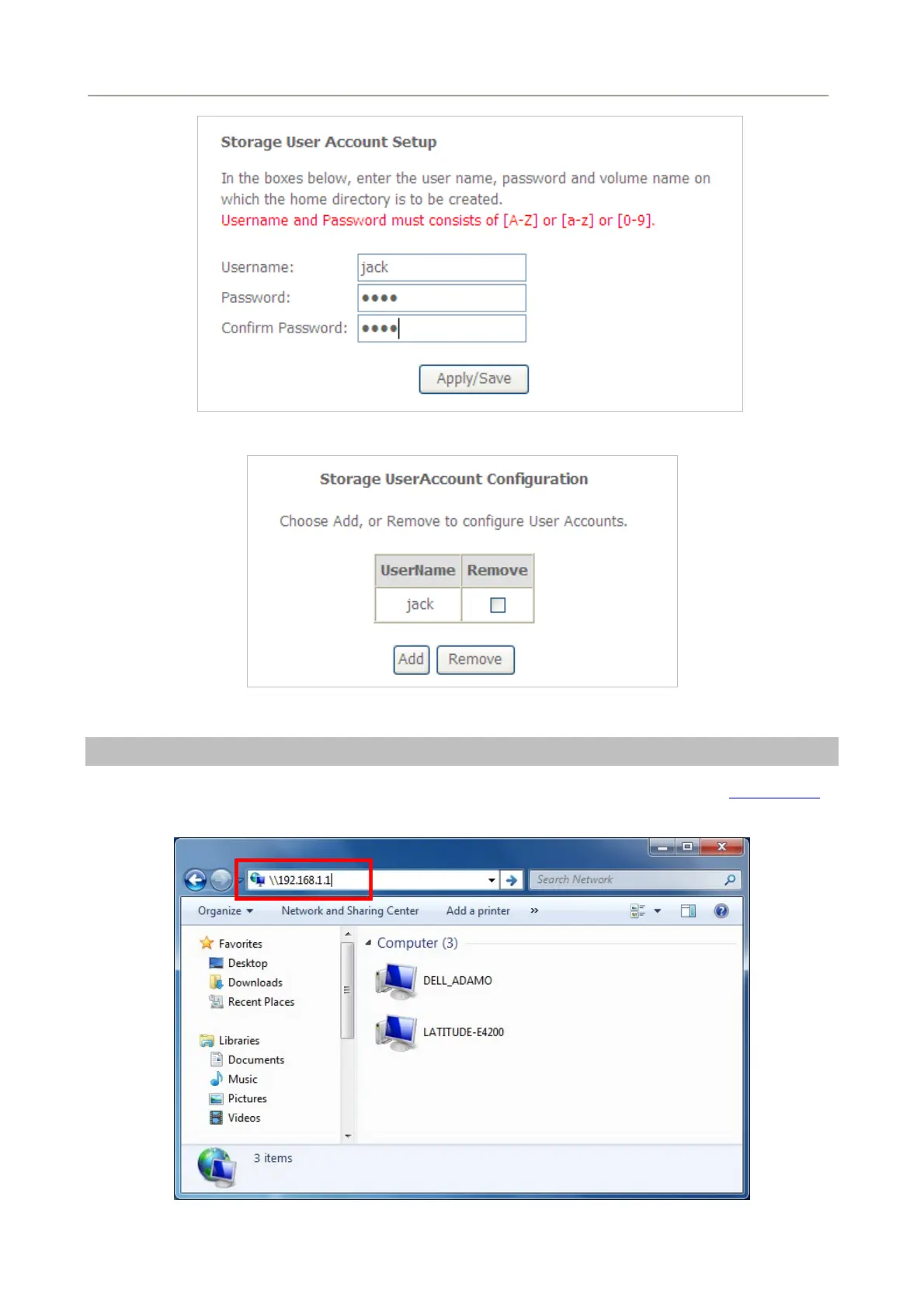 To access resources on such storage device, double click “Computer” on your PC and enter \\192.168.1.1