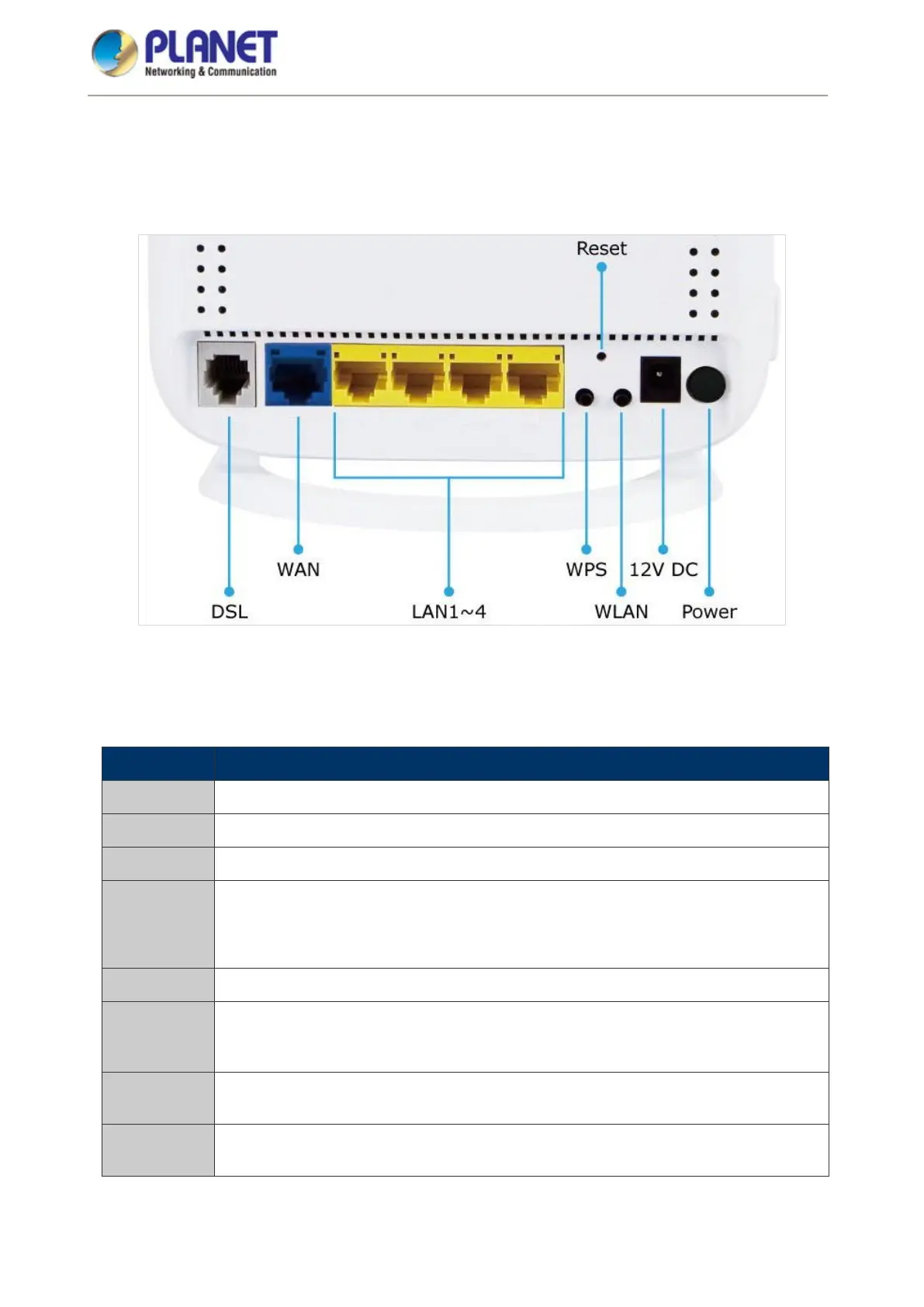The rear panel provides the physical connectors connected to the power adapter and any other network device.