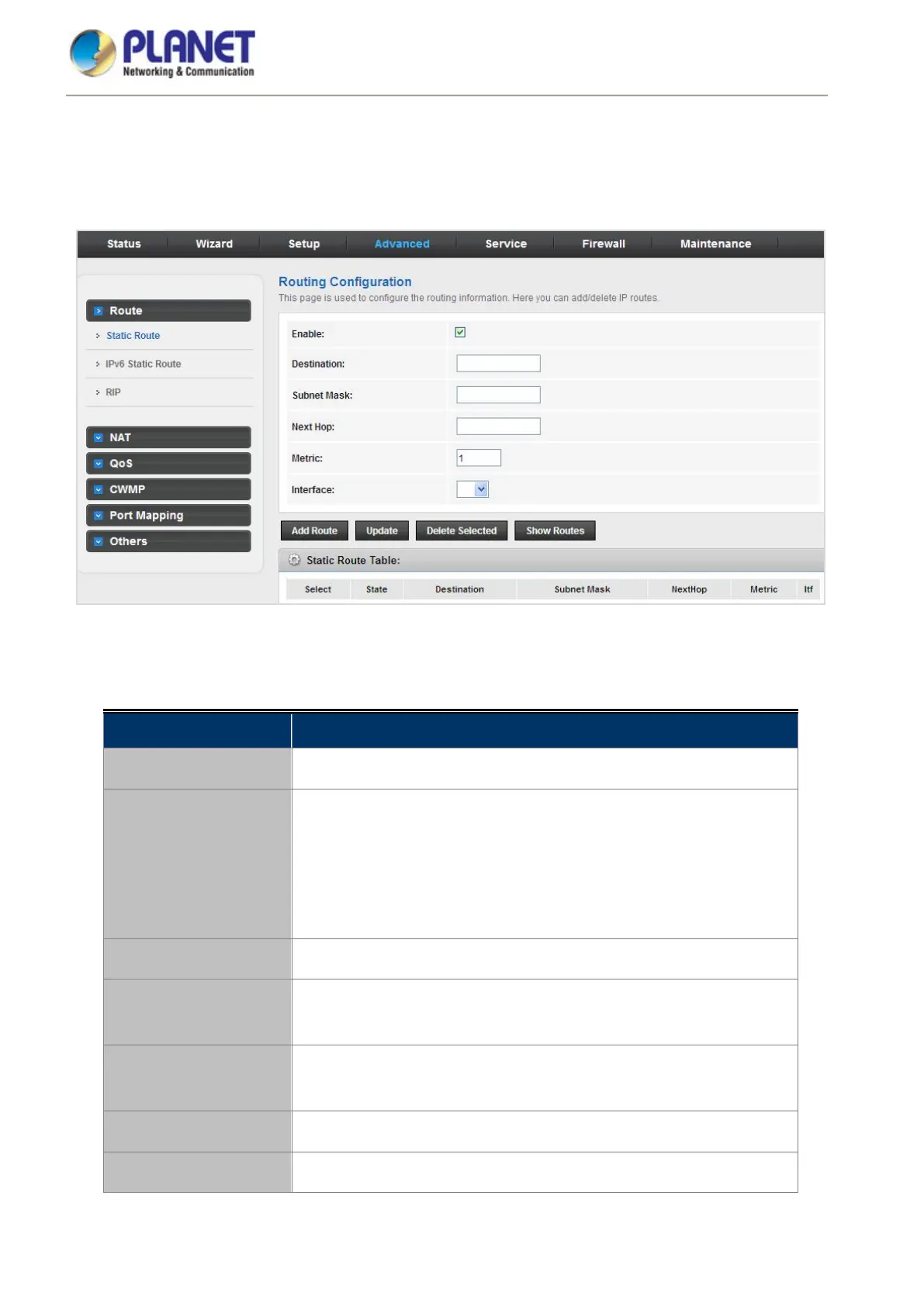 Click Static Route in the left pane and the page shown in the following figure appears. This page is used to