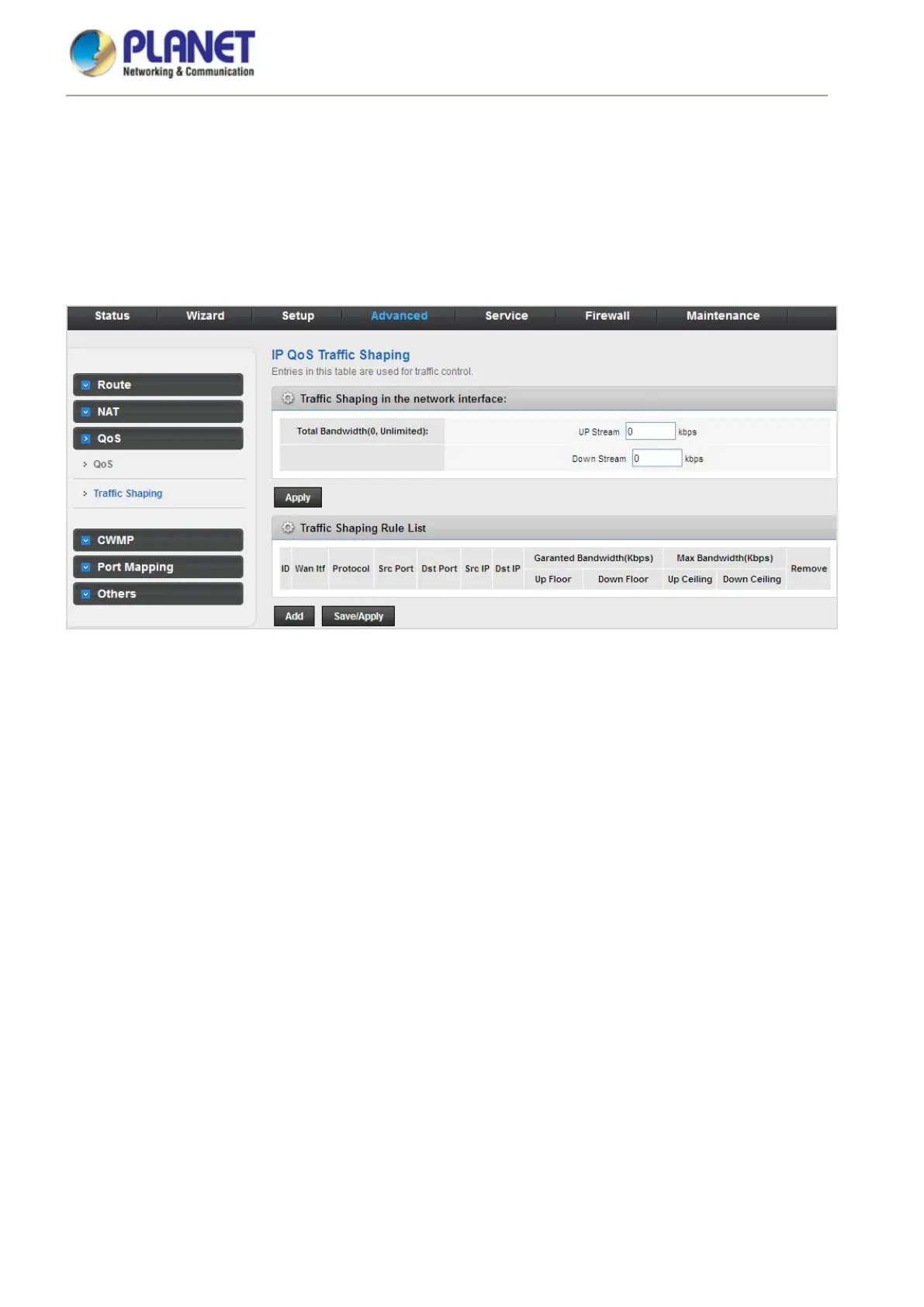 Choose Advanced > QoS > Traffic Shaping and the page shown in the following page appears. The traffic