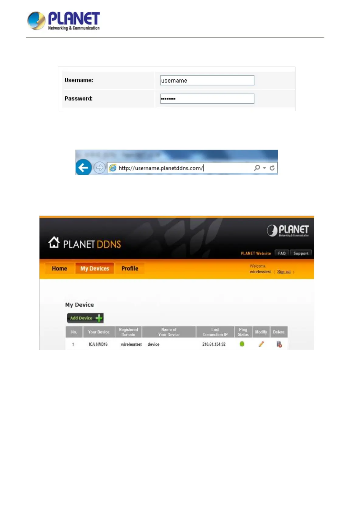 You can go to My Devices page of Planet DDNS website to check if the “Last Connection IP” is displayed. This