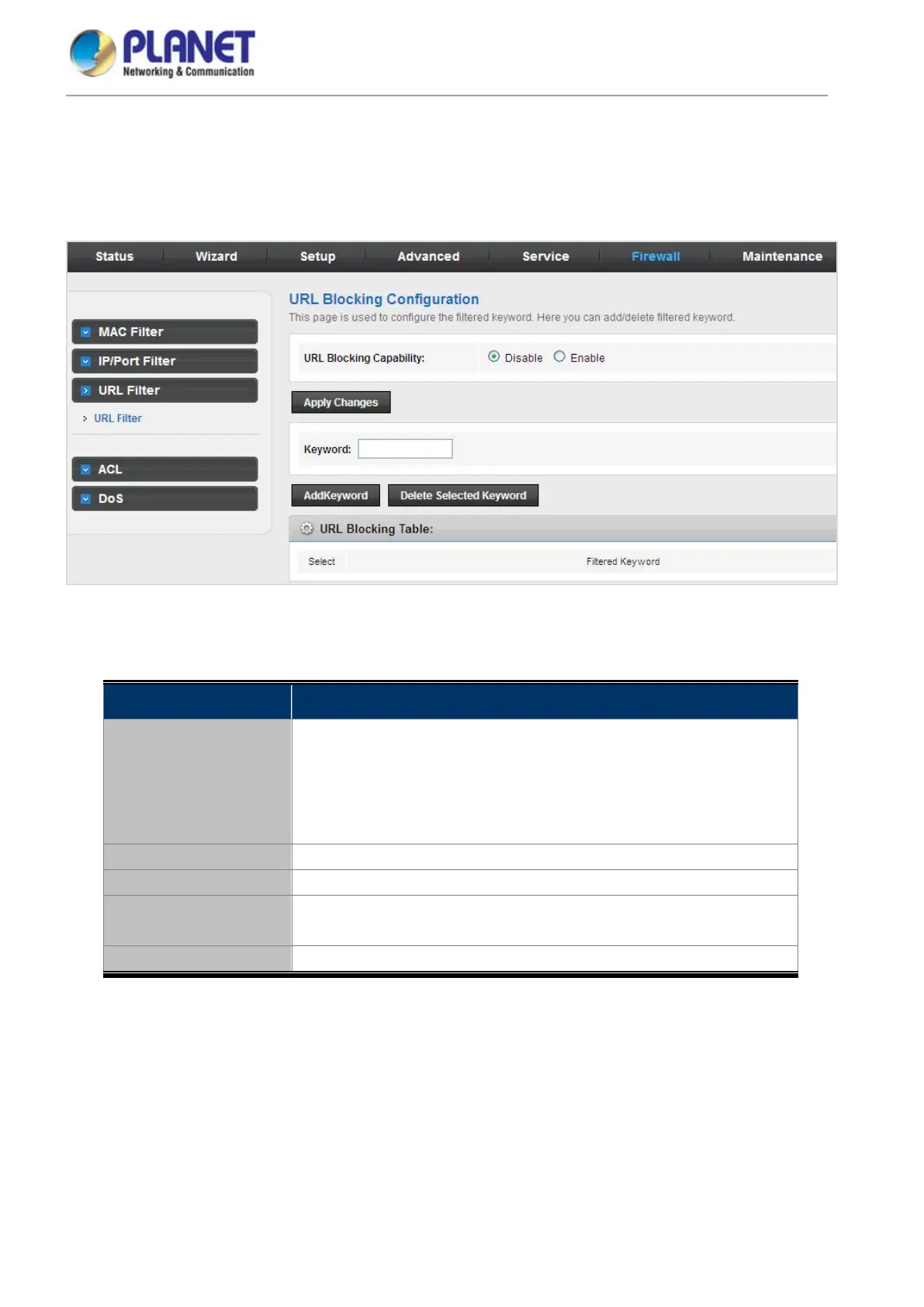Click URL Filter in the left pane and the page shown in the following figure appears. This page is used to block a