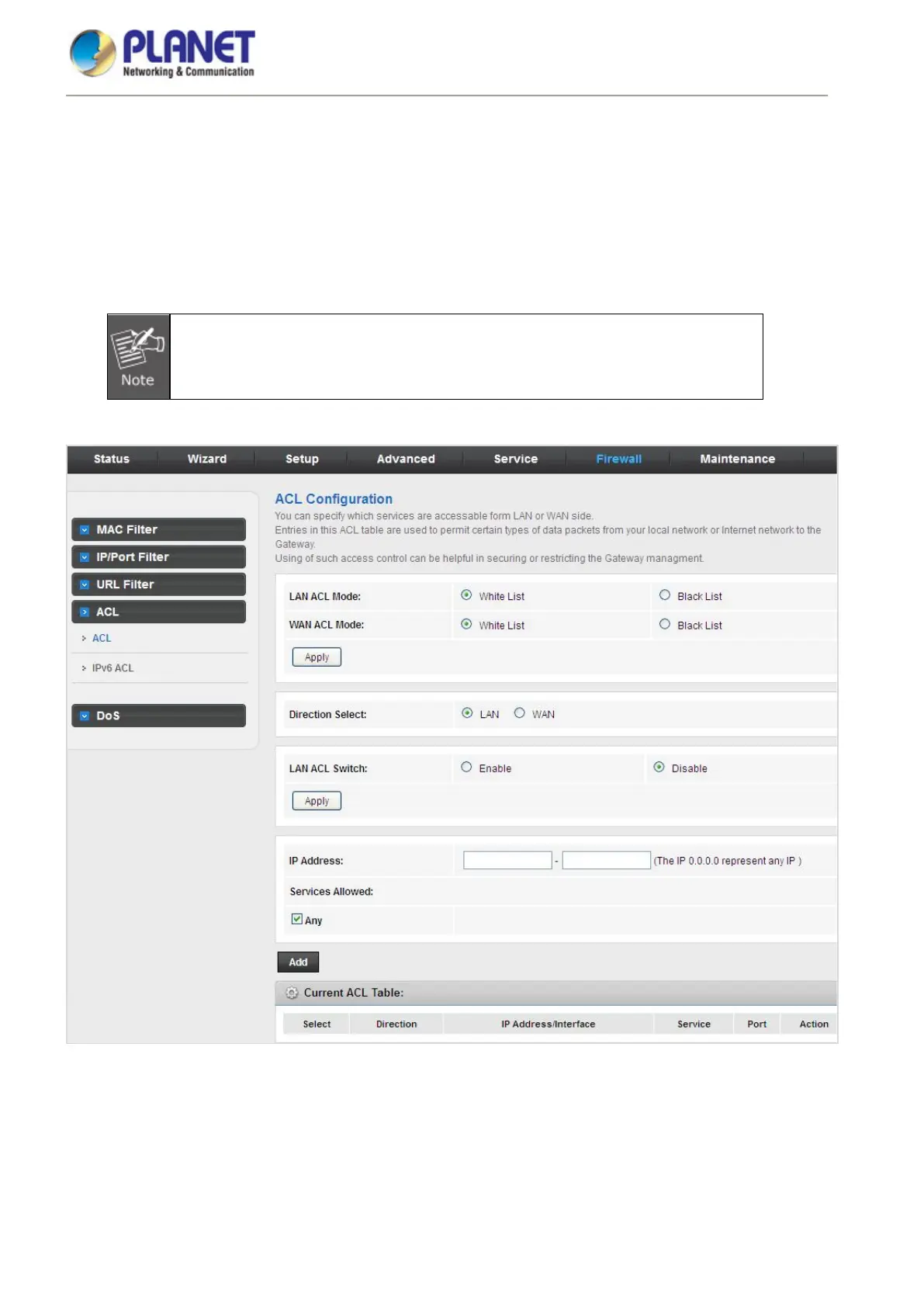 (ACL). If ACL is enabled, only the effective IP address in the ACL can access the router.