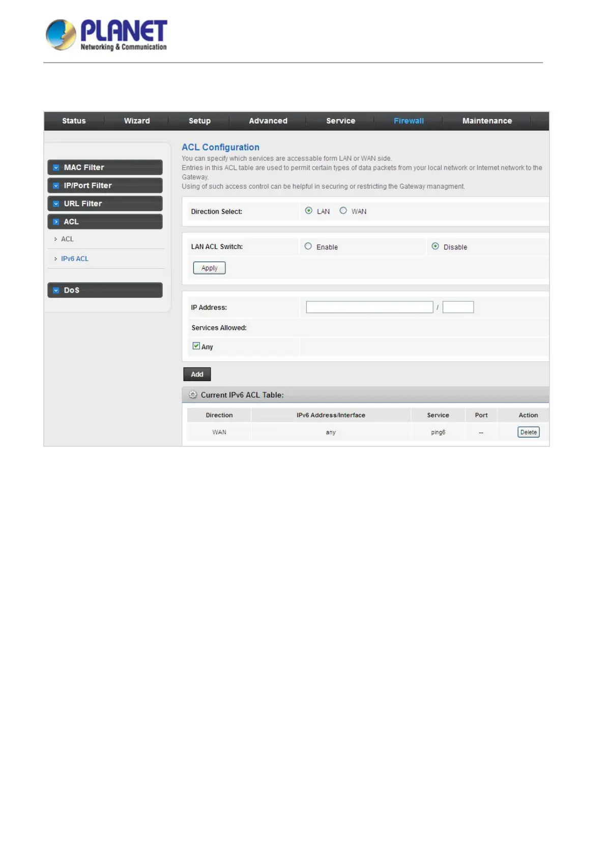 Choose Service > IPv6 ACL and the page shown in the following figure appears.
