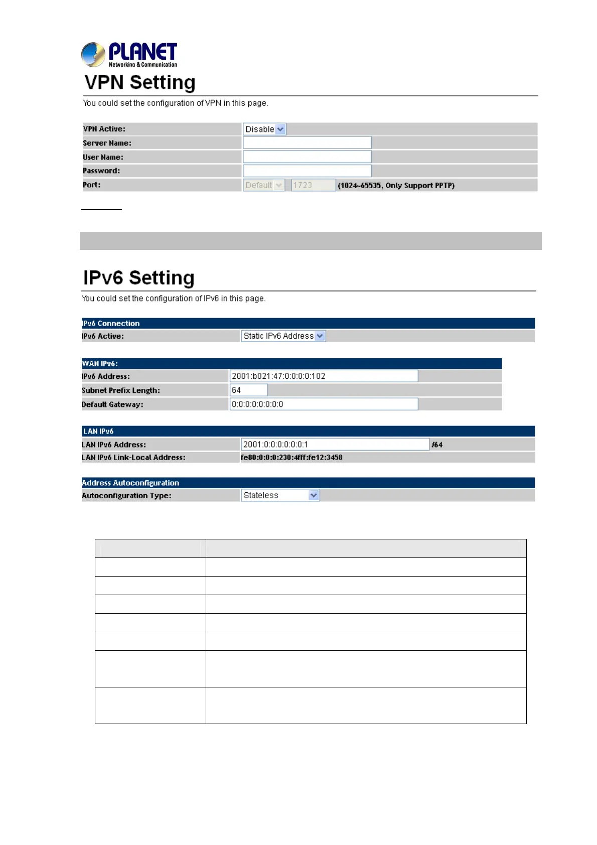 This page defines the IPV6 setting on this page. You can program the IPV6 information.