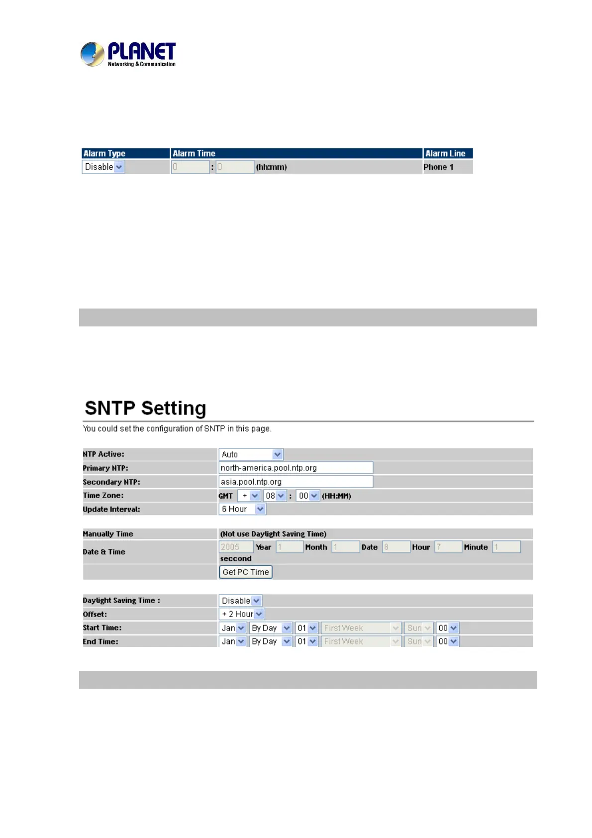 This page defines the primary and second SNTP Server IP Address to get the date/time information.