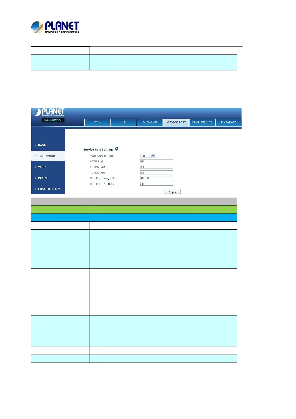 User can set the port of telnet/HTTP/RTP on this page.