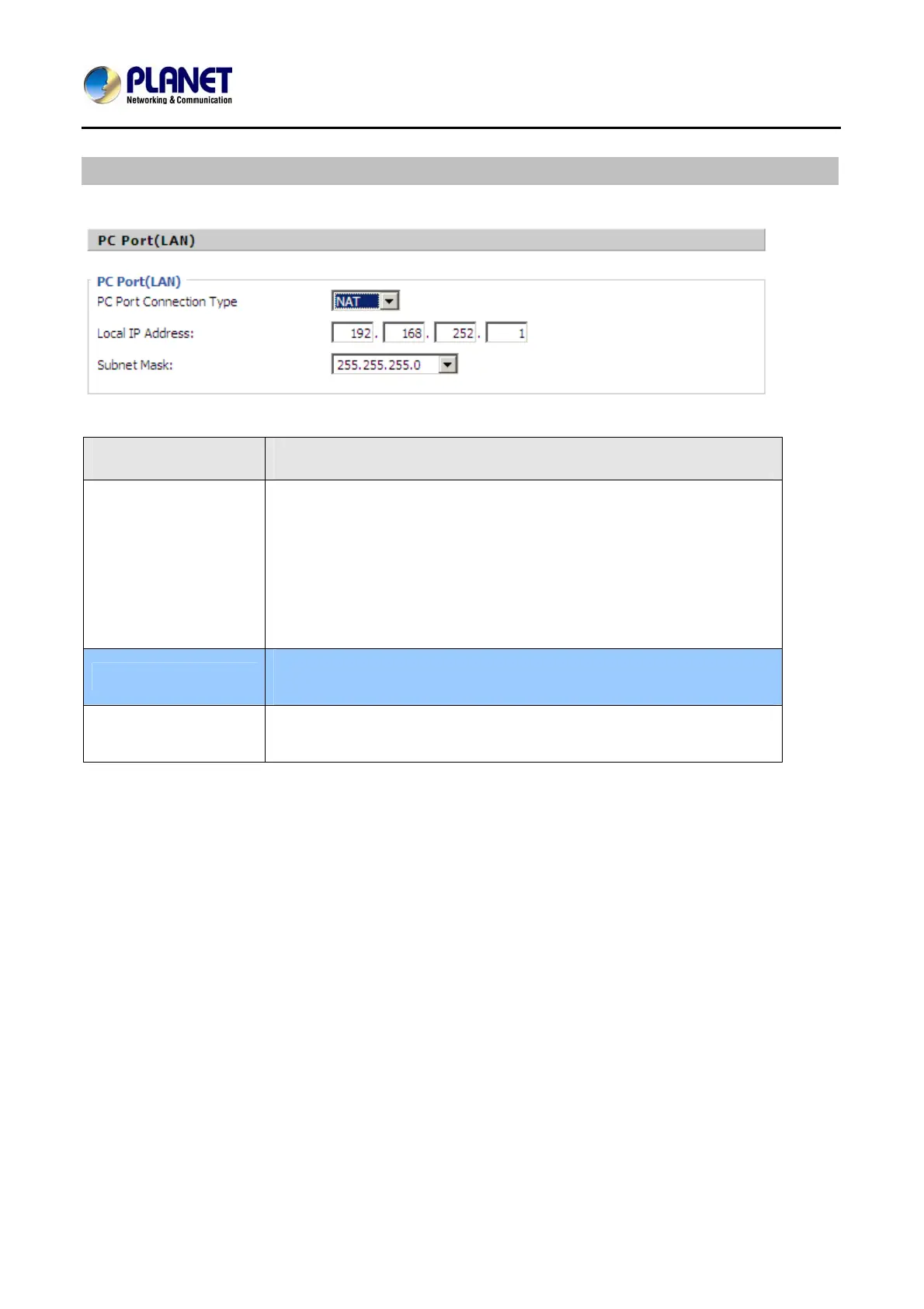 Choose the PC port connection type from disable, NAT and Bridge.