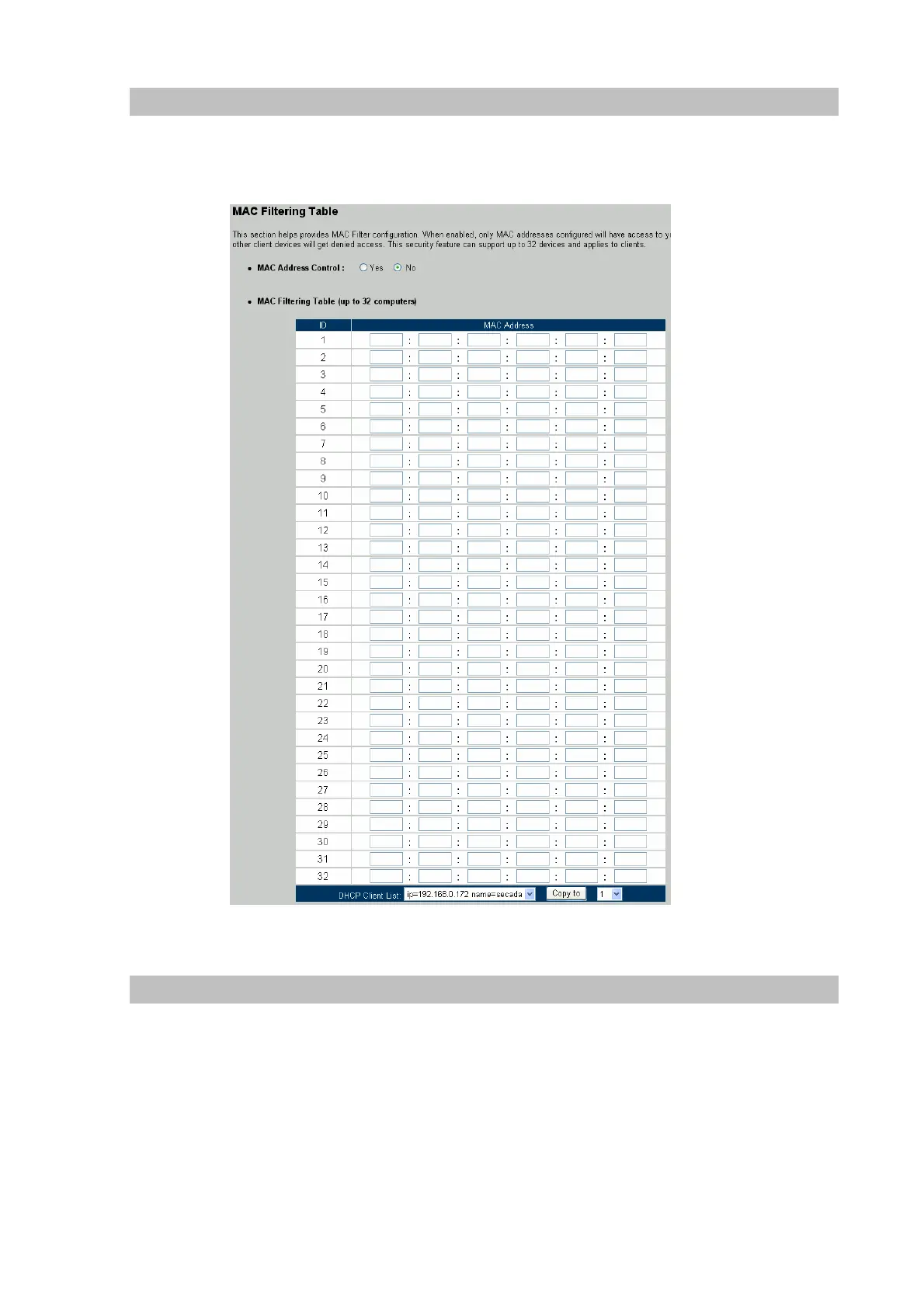 User can enter up to 32 MAC address, the PCs with these MAC addresses will not be permitted to