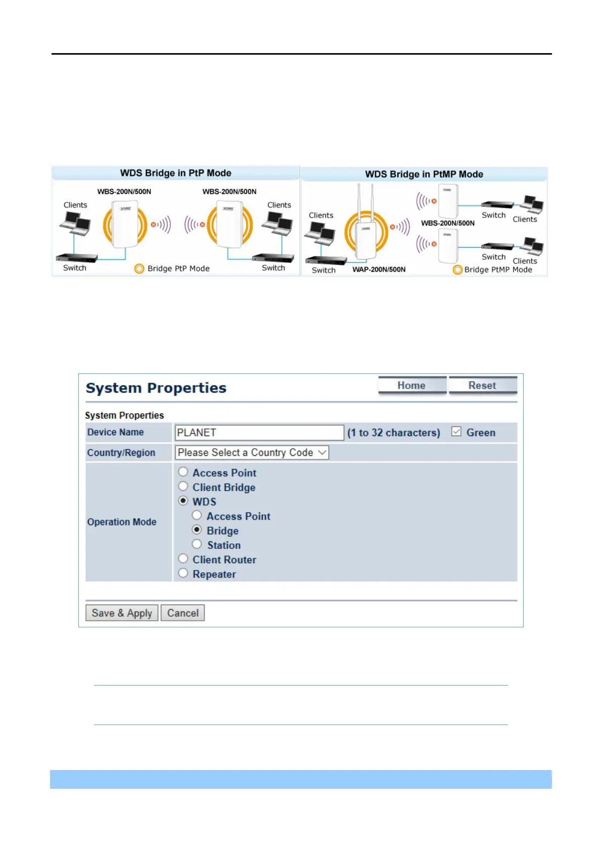 WDS Link Settings” to configure the WDS bridge mode in PtP (Point to Point) or PtMP (Point to