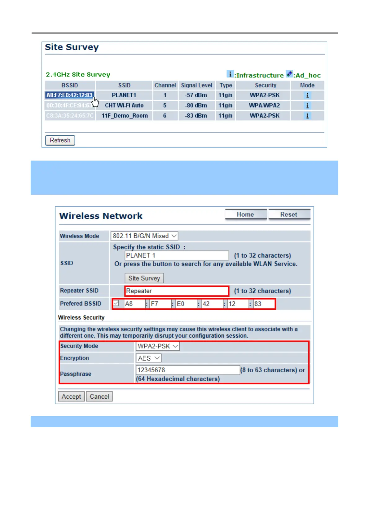 The Repeater SSID can be modified to an easily-recognized name for wireless clients. Then, click “Accept” to