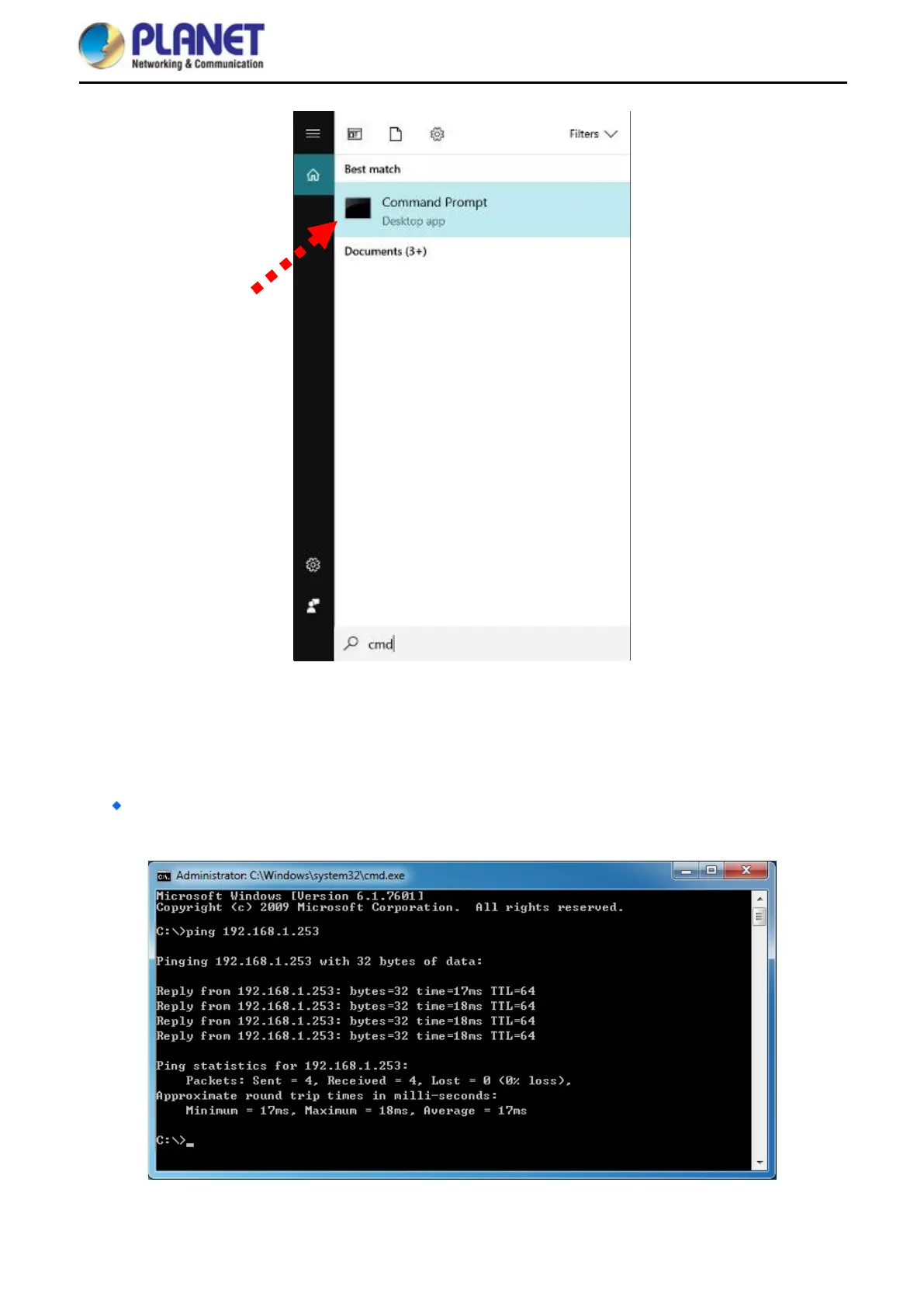 3. Open a command prompt, type ping 192.168.1.253 and then press Enter.