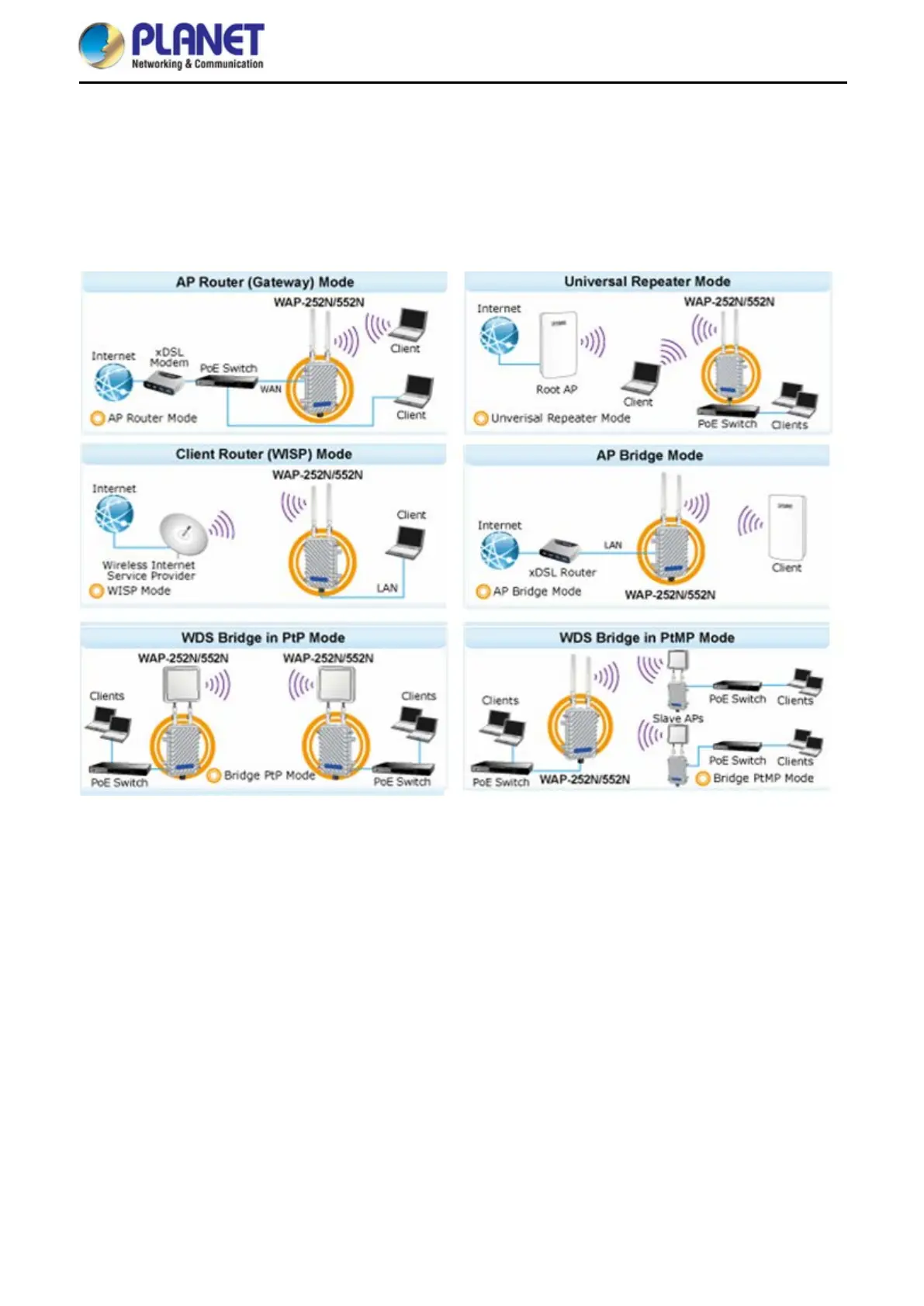 To provide maximum performance, the WAP-252N/WAP-552N can implement multiple operation modes where a