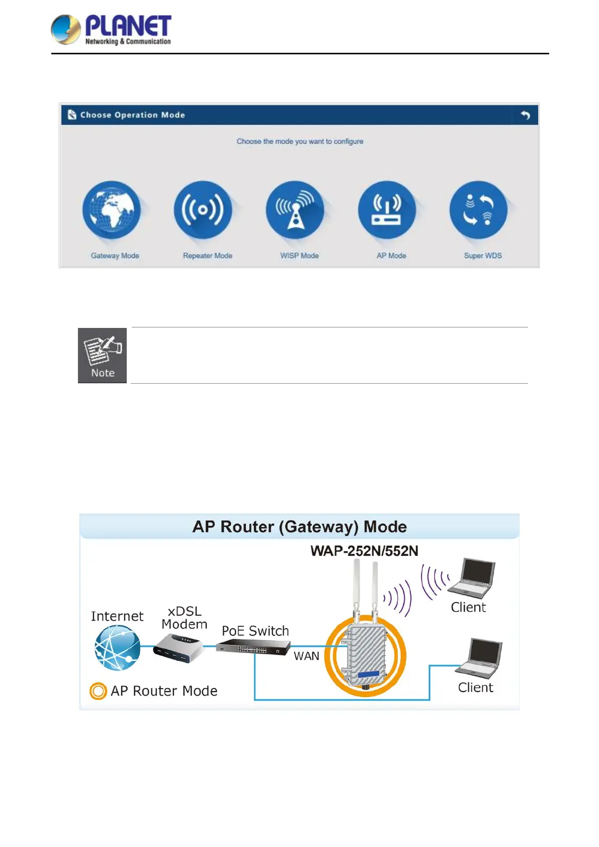 The Wizard guides you to configuring the WAP-252N/WAP-552N in a different mode, including Gateway,