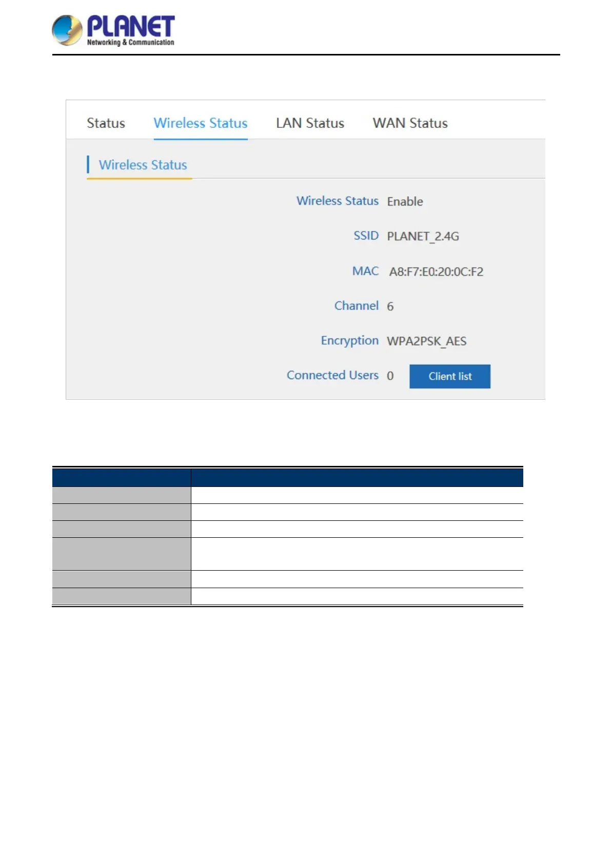 SSID It shows the SSID of the AP. Default is PLANET_2.4G or PLANET_5G