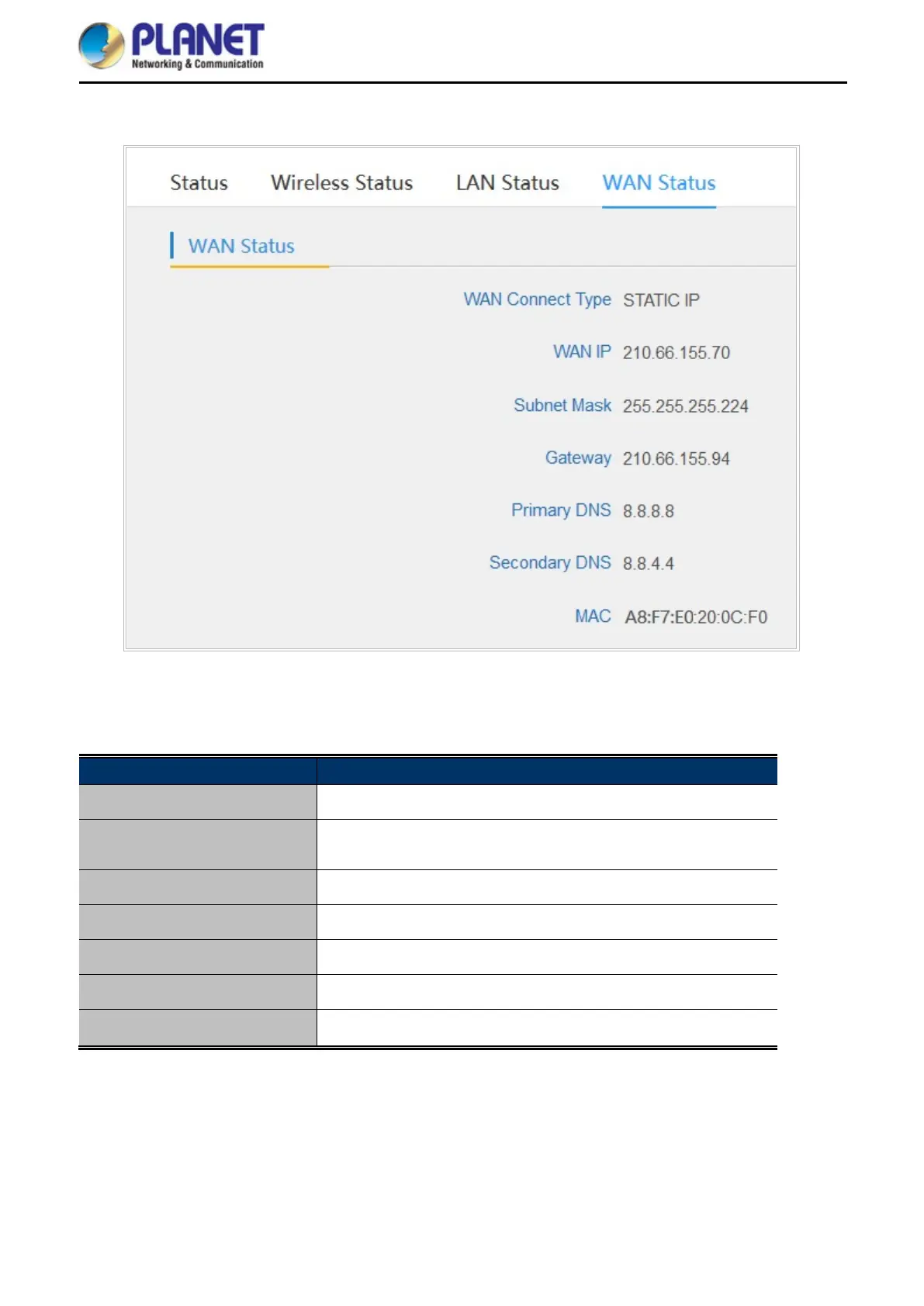 WAN Connection Type It shows WAN connection type, PPPoE, DHCP or STATIC IP