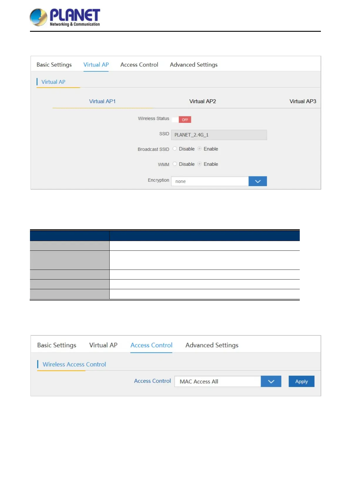 SSID It shows the SSID of the AP. Default is PLANET_2.4G_1 or
