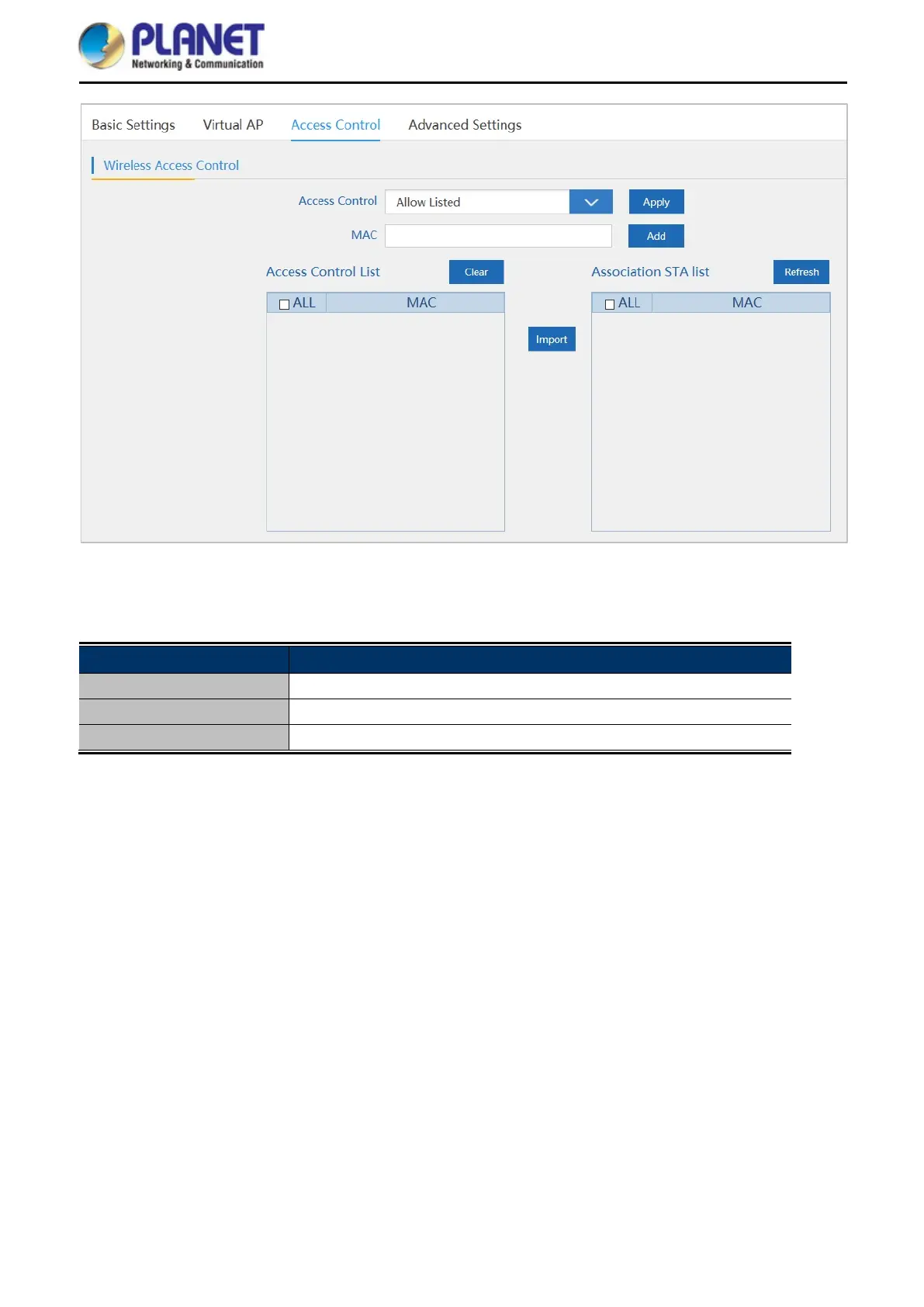 Access Control Select MAC Access All, Allow Listed or Deny Listed