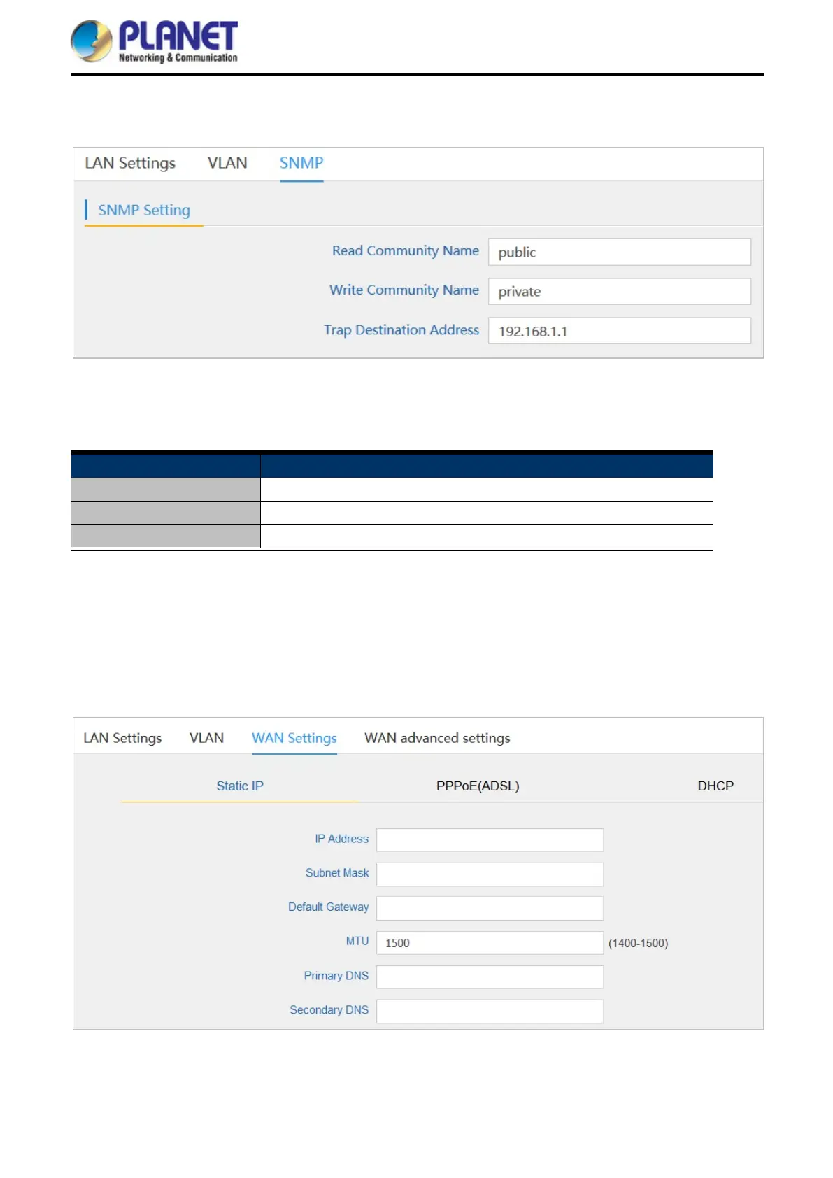 Trap Destination Address Enter the SNMP trap IP address; default is 192.168.1.1.