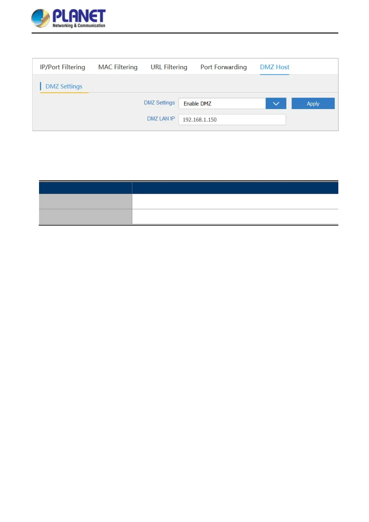 Planet WAP-252N - DMZ Host Setup; DMZ Configuration