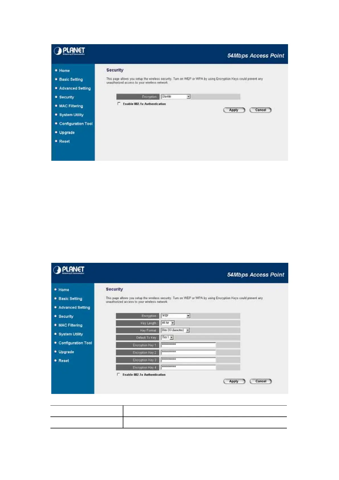 When you select 64-bit or 128-bit WEP key, you have to enter WEP keys to encrypt data. You