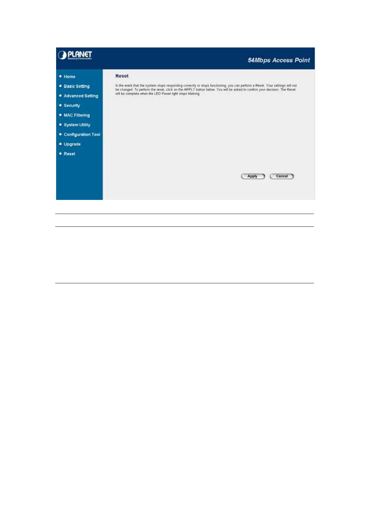 procedure. To perform the reset, click on the Apply button. You will be asked to