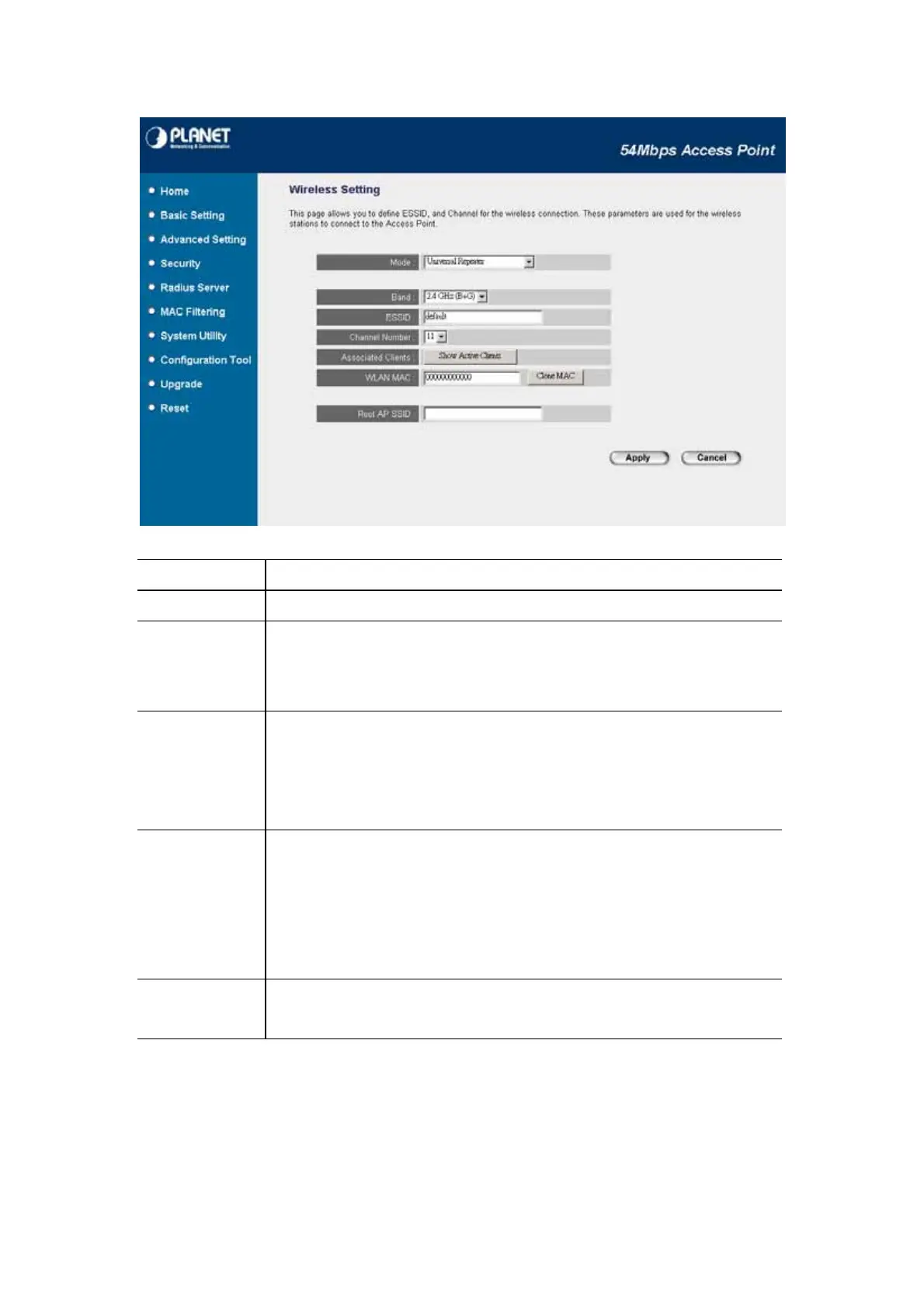 2.4GHz (G): It allows to select the transmit rate up to 54Mbps.