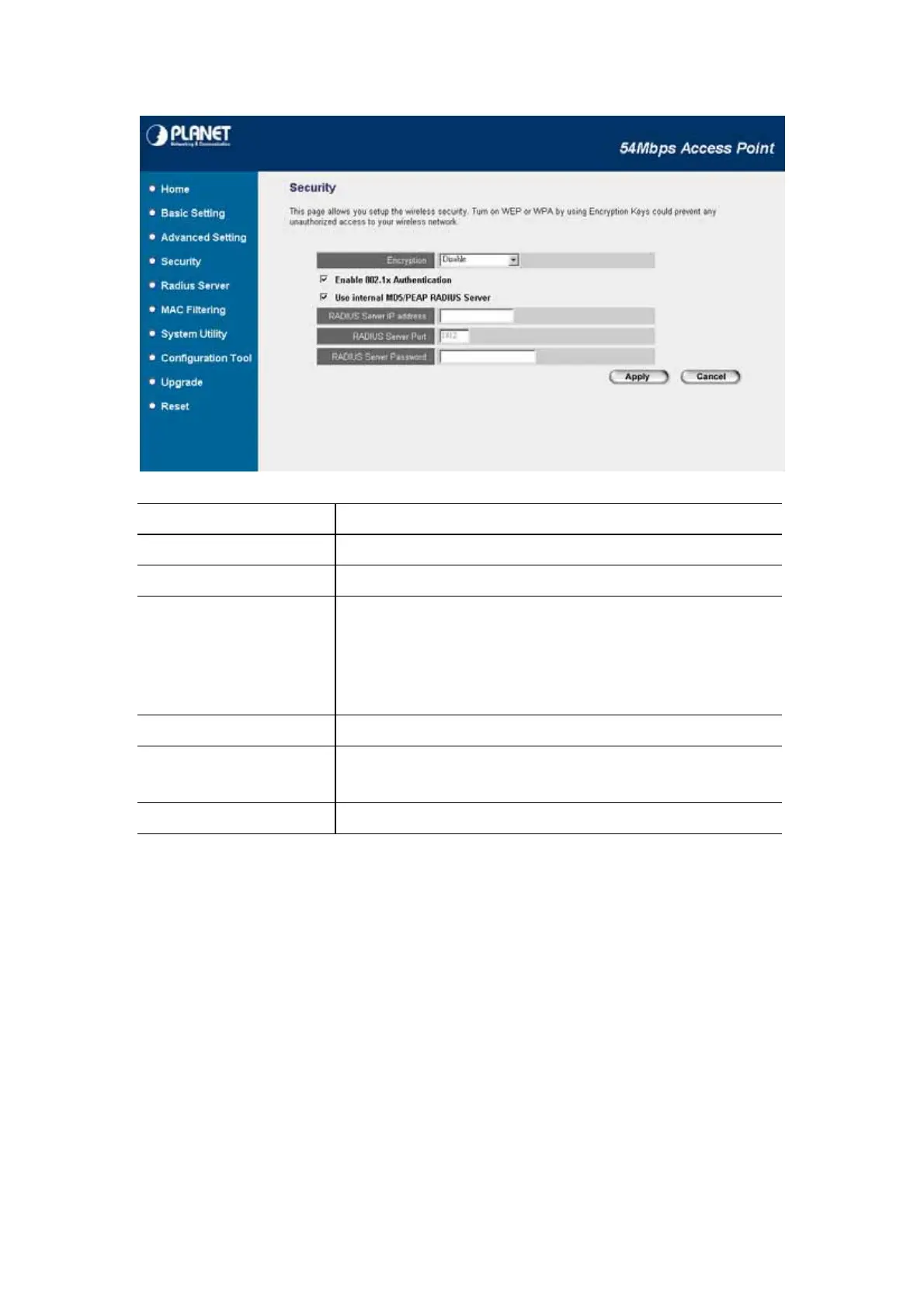 Encryption If you want to use 802.1x only, keep this setting in “Disable”.