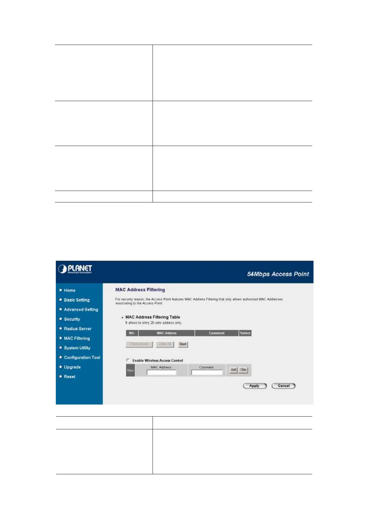 MAC Address Filtering Table This table records the MAC addresses of wireless stations you
