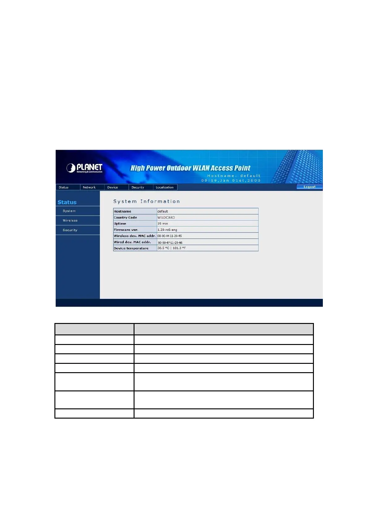Device temperature The temperature on CPU of WAP-8000