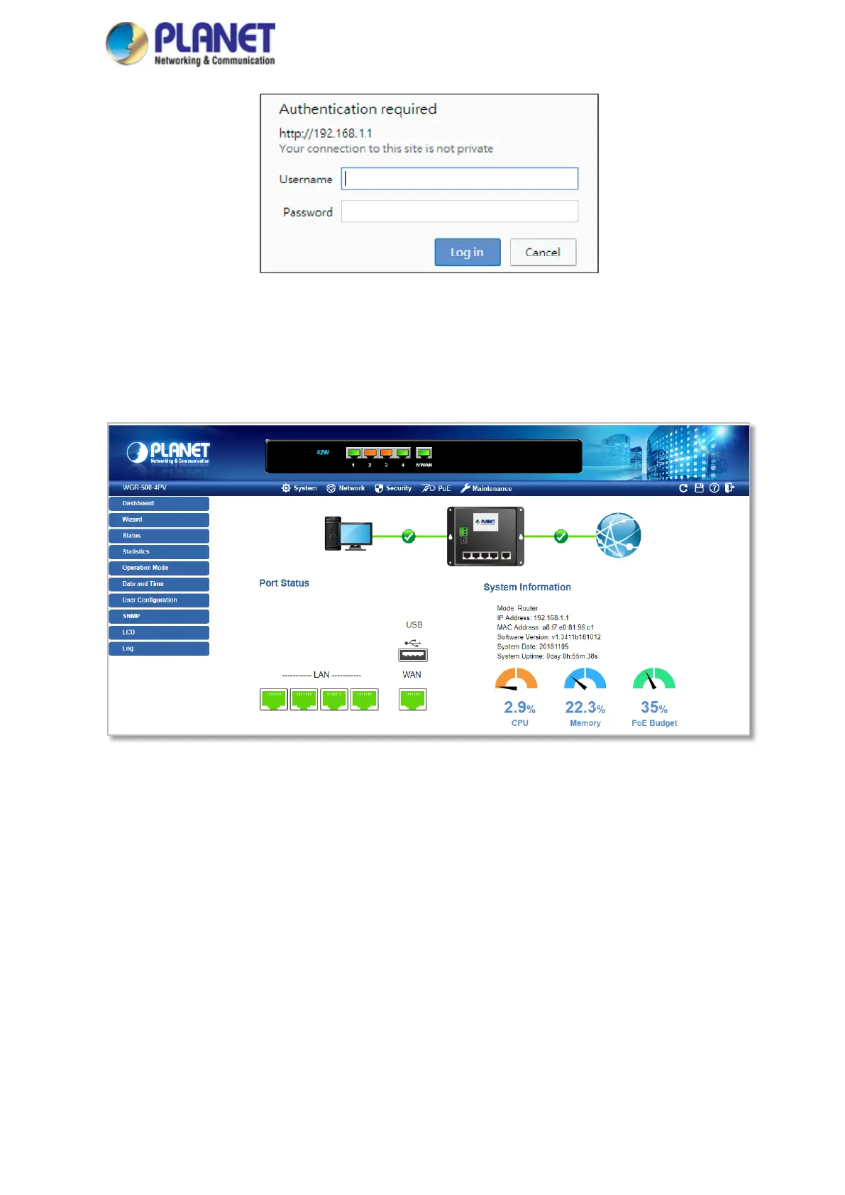 and sub menus on the left side. The Figure 3-3 is the web main page of the WGR-500-4PV.