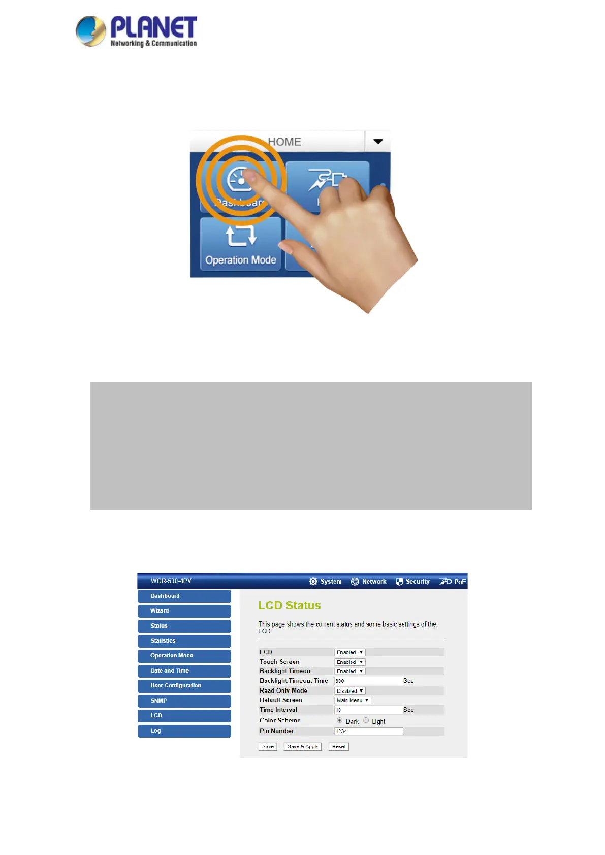 The WGR-500-4PV has a 2.4-inch color LCD touch screen with management functions. Tap the LCD touch screen