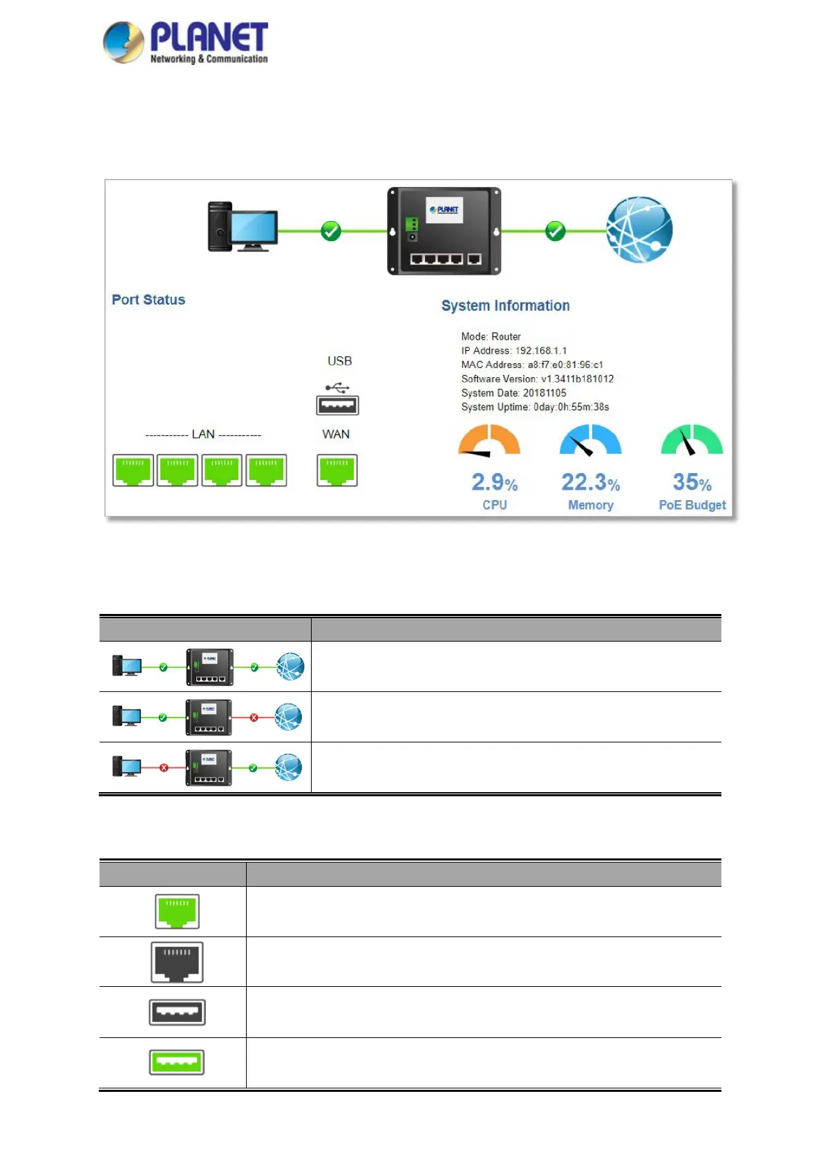 The status means WAN is connected to Internet and LAN is