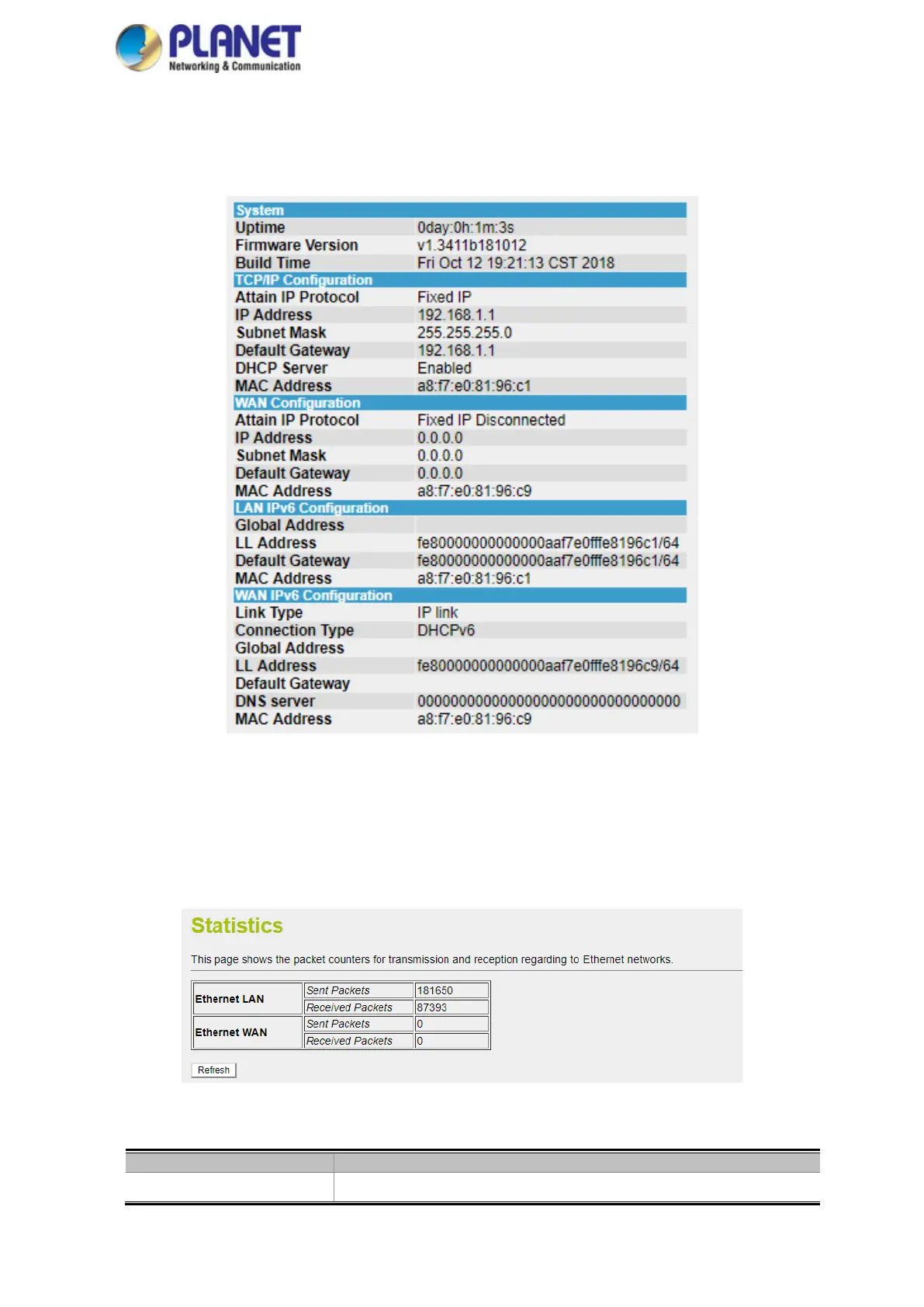 This page displays the number of packet that pass through the router on the WAN and LAN. The statistics are