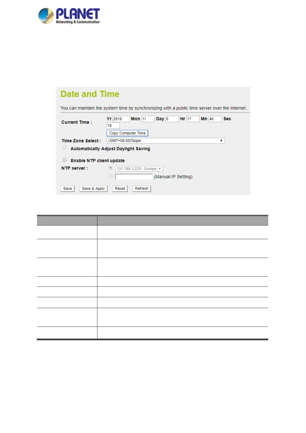 User may select NTP sever or input address of NTP server manually.