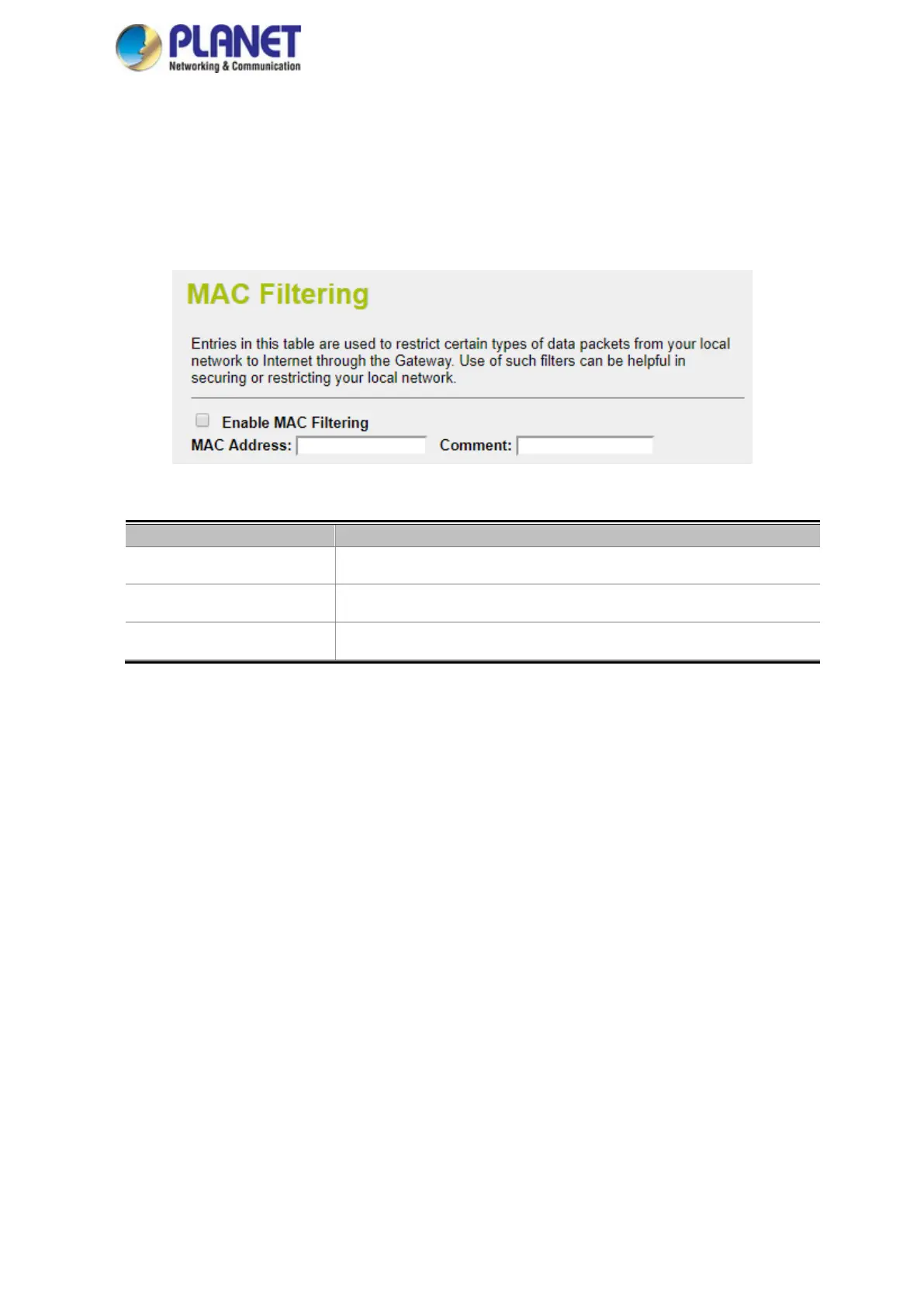 Enable MAC Filtering Check this box to enable MAC filtering.
