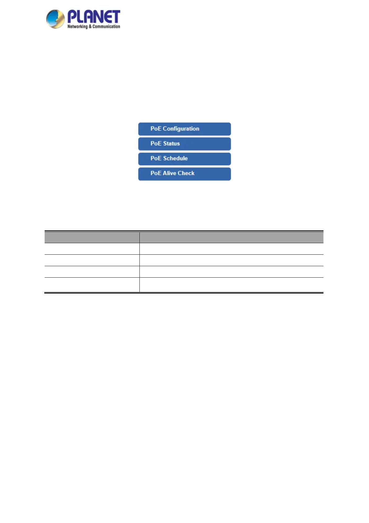 configured, monitored and scheduled. The PoE menu provides PoE Configuration and other functions as shown in