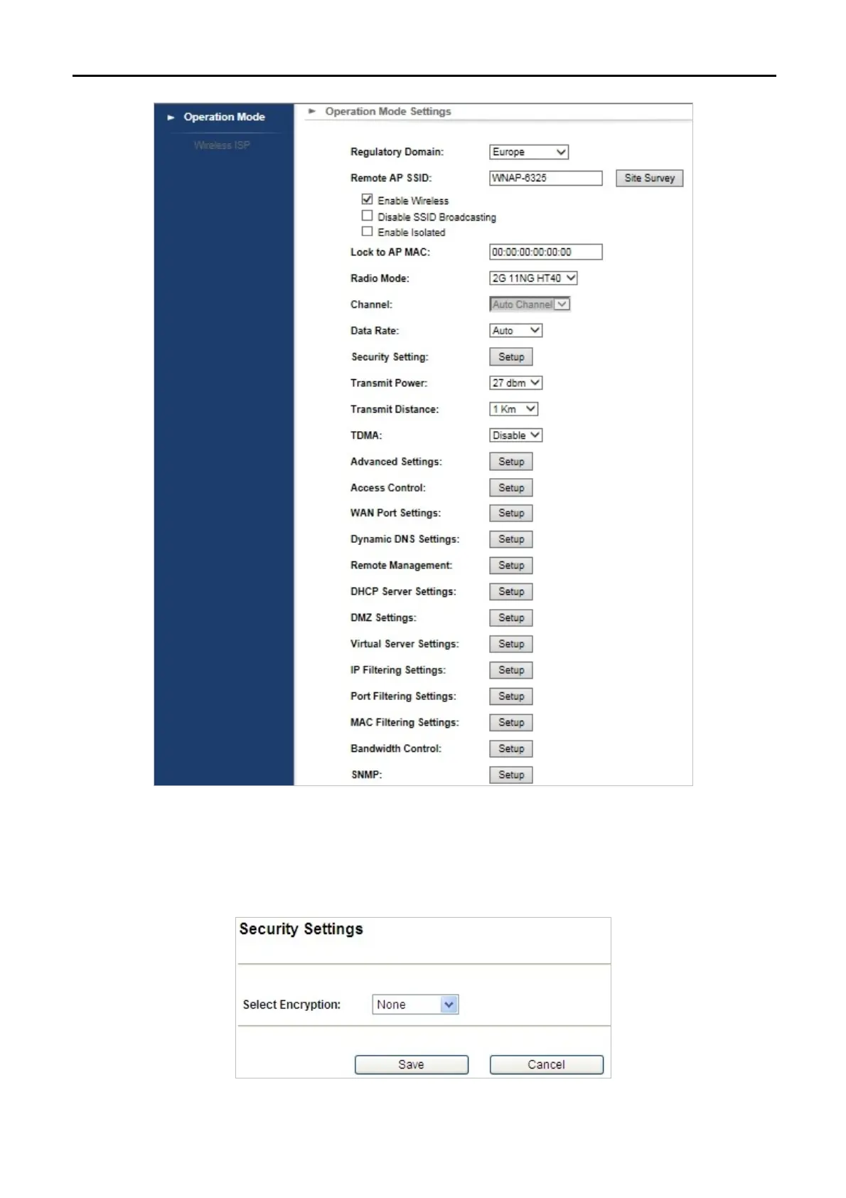Choose the operation mode you required, and then enter “Security Setting” by clicking the Setup button next to