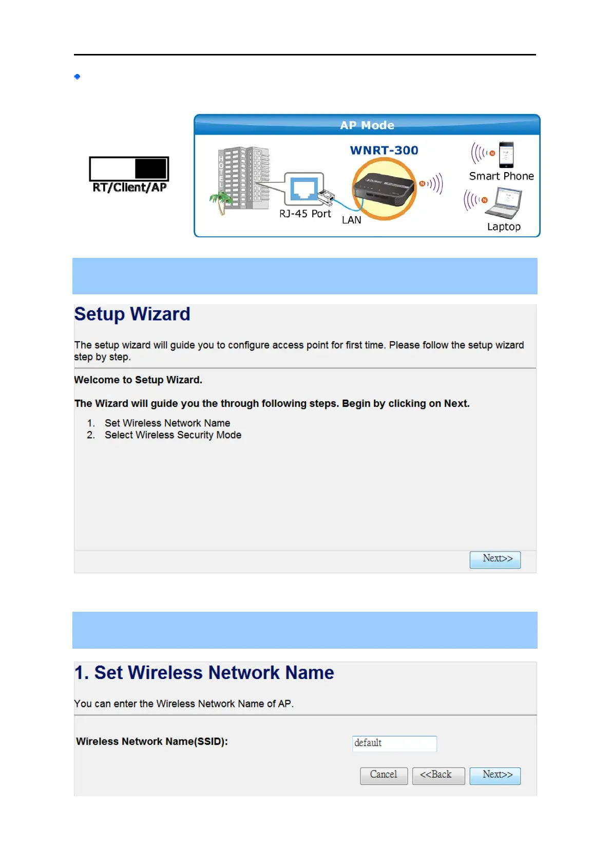 Step 1. The figure below is the screen of the Setup Wizard in AP Mode. Please click the “Next>>”