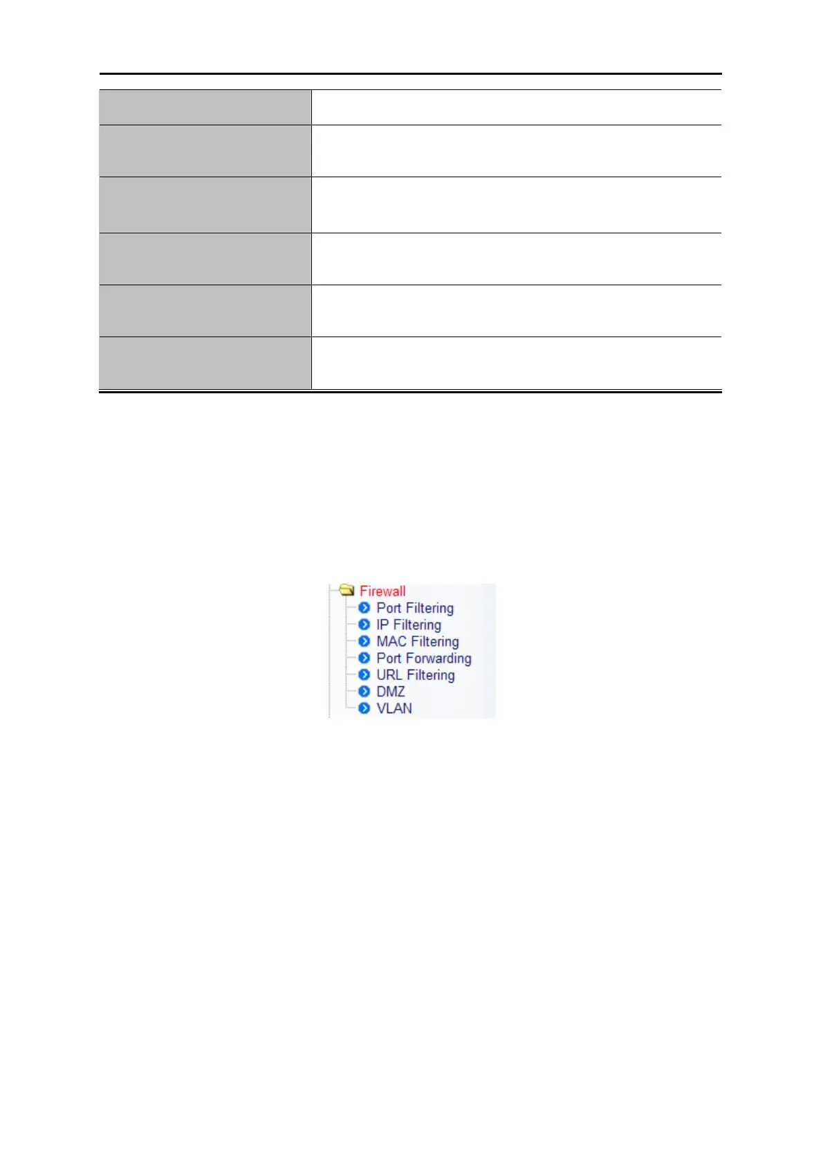 The Firewall menu contains submenus of the settings about firewall and access filtering. Please refer
