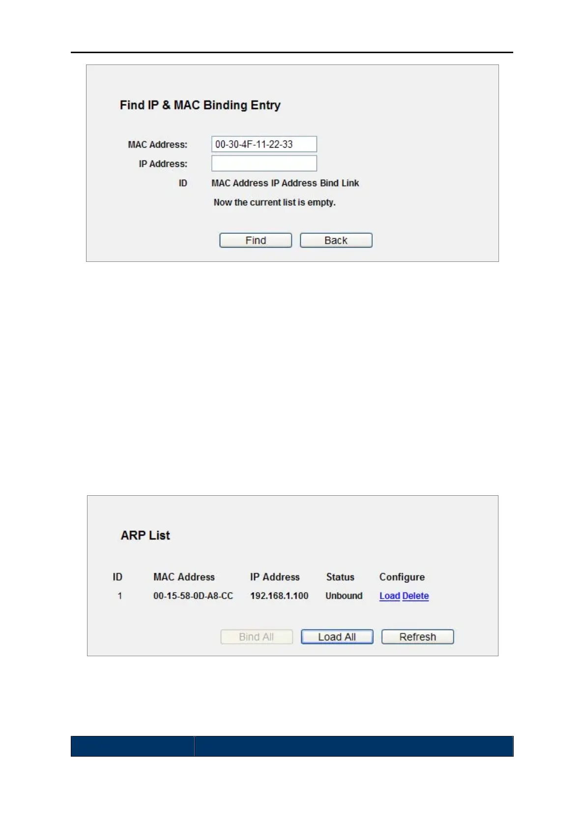 This page displays the ARP List; it shows all the existing IP & MAC Binding entries (shown in Figure