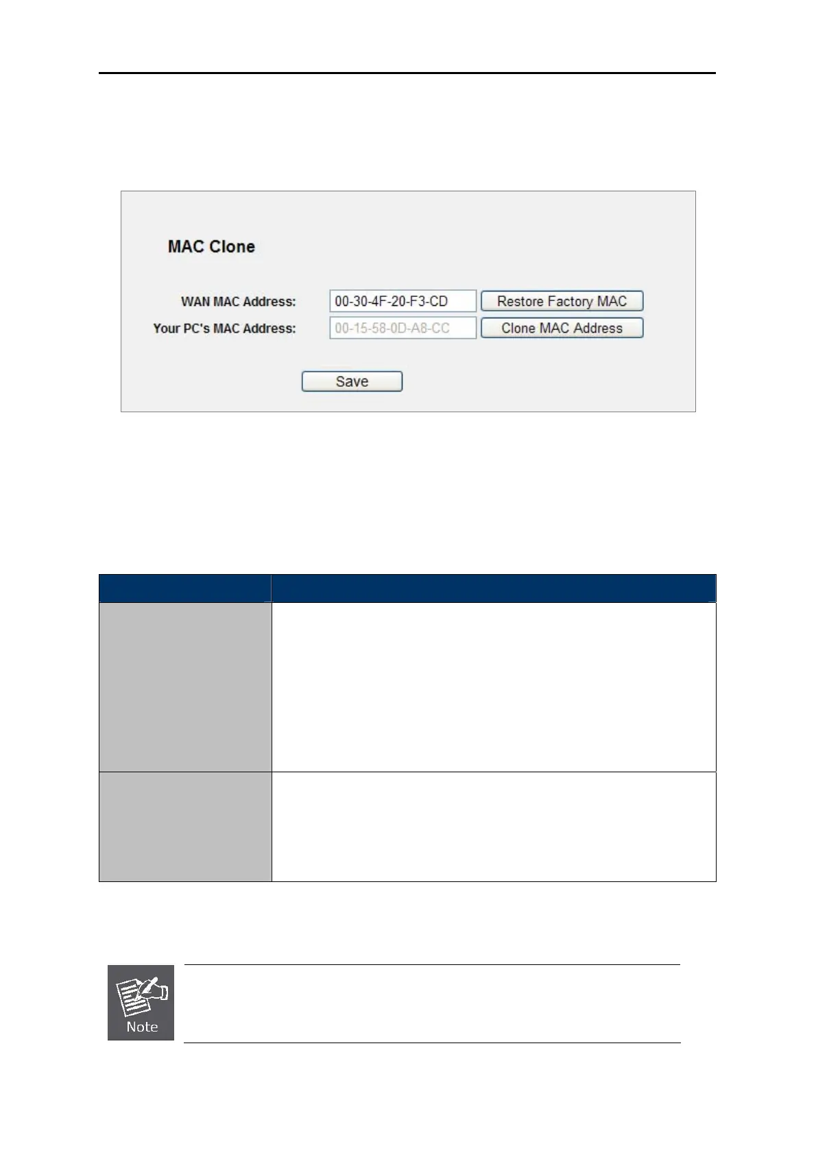 Choose menu “Network→MAC Clone”, you can configure the MAC address of the WAN on the