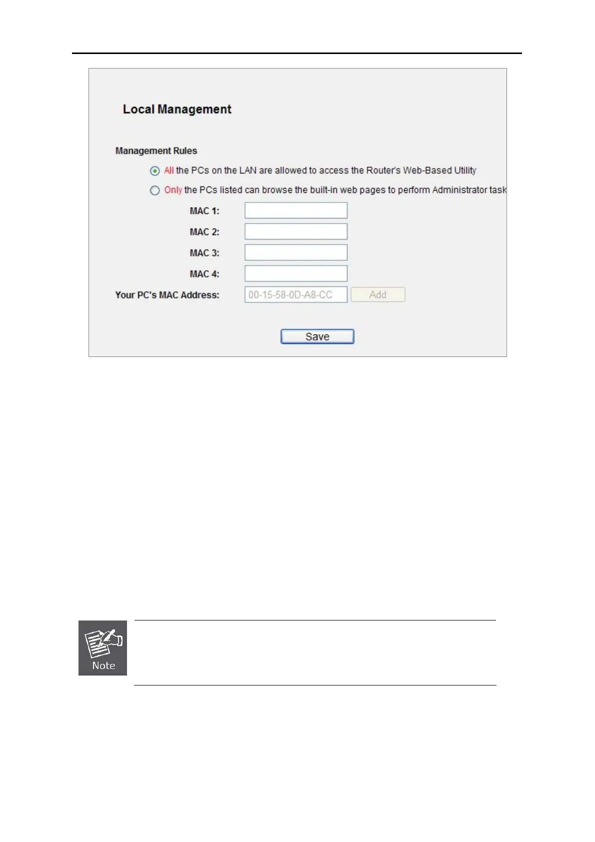 “Only the PCs listed can browse the built-in web pages to perform Administrator tasks”, and