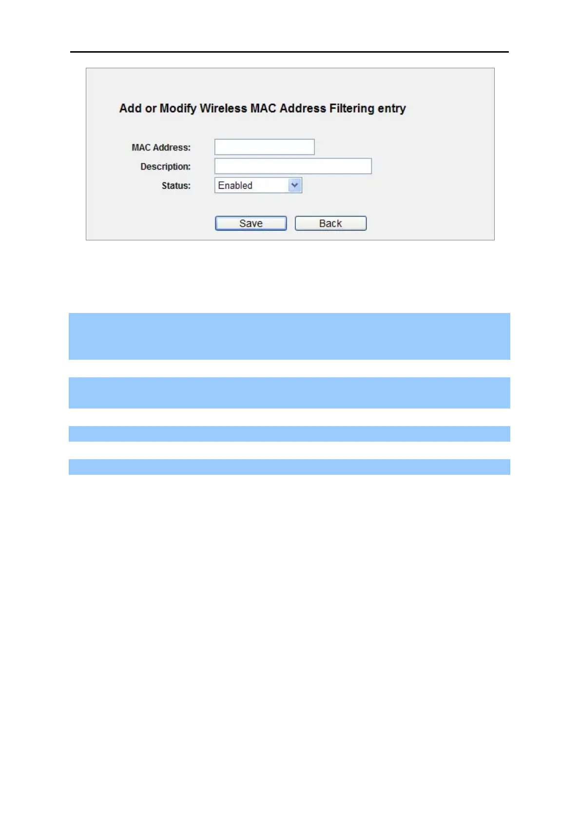 To add or modify a MAC Address Filtering entry, follow these instructions: