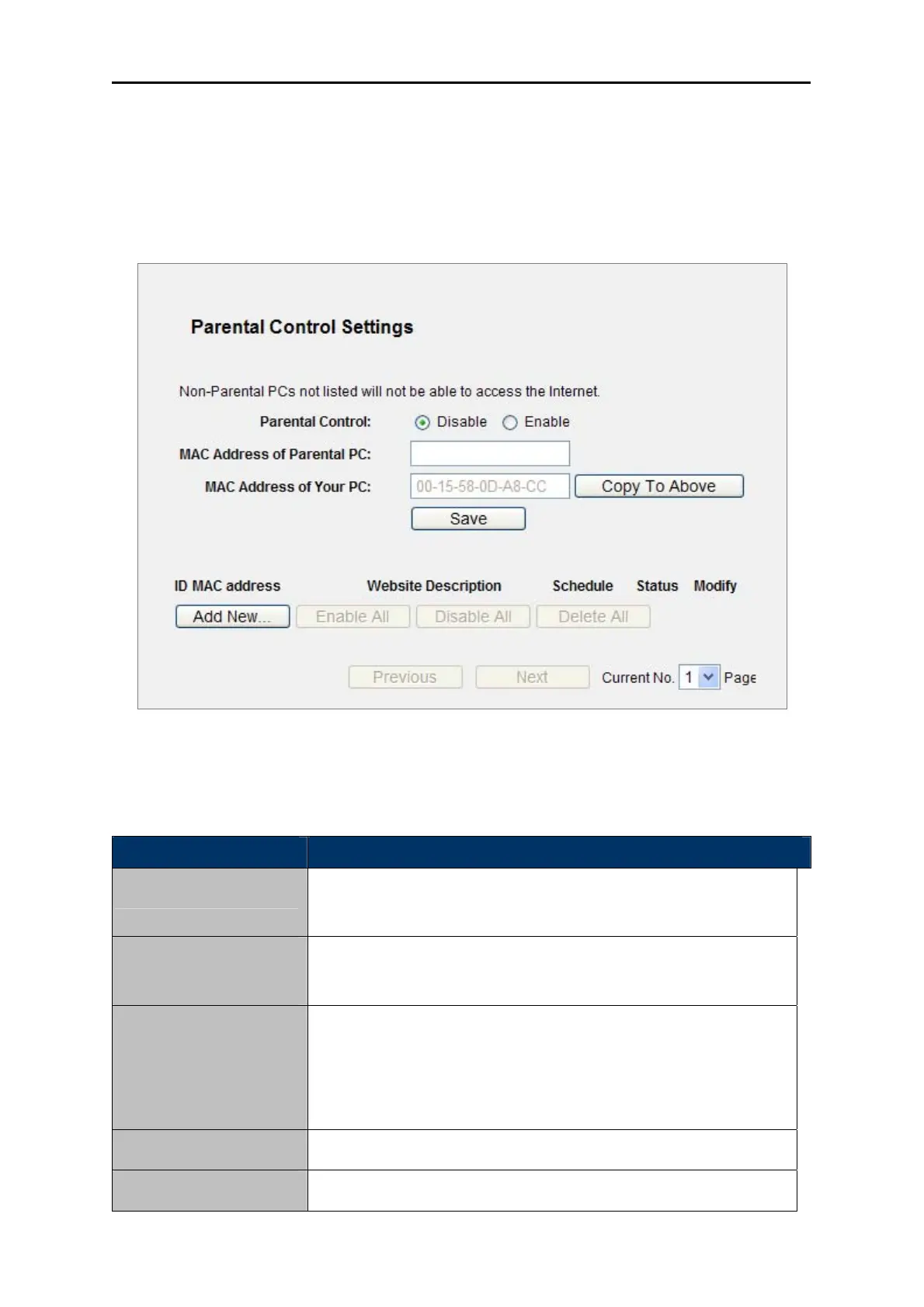 Choose menu “Parental Control”, and you can configure the parental control in the screen as shown