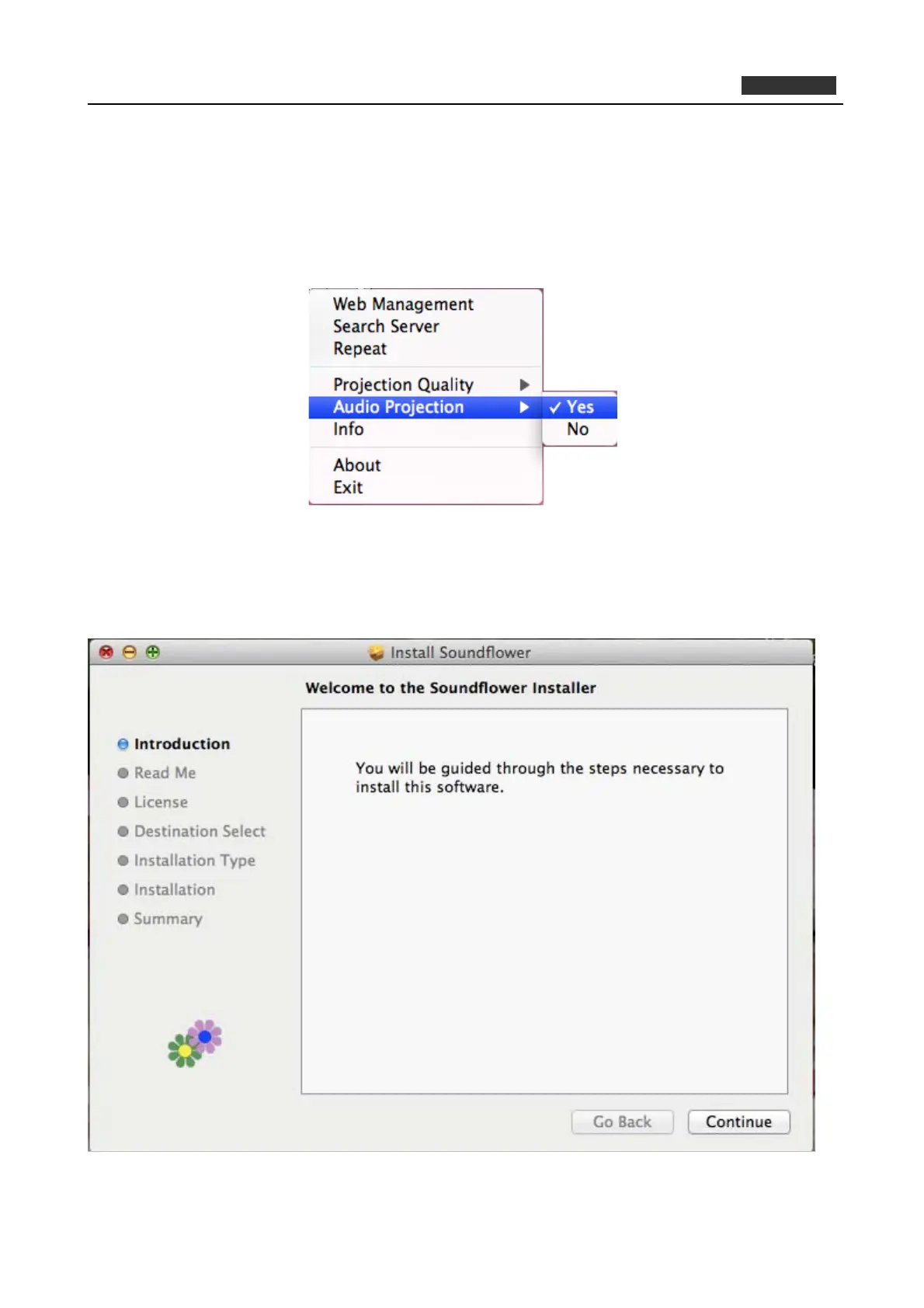 First, before starting Audio Projection, please install the “Soundflower.mpkg” (MAC system extension for