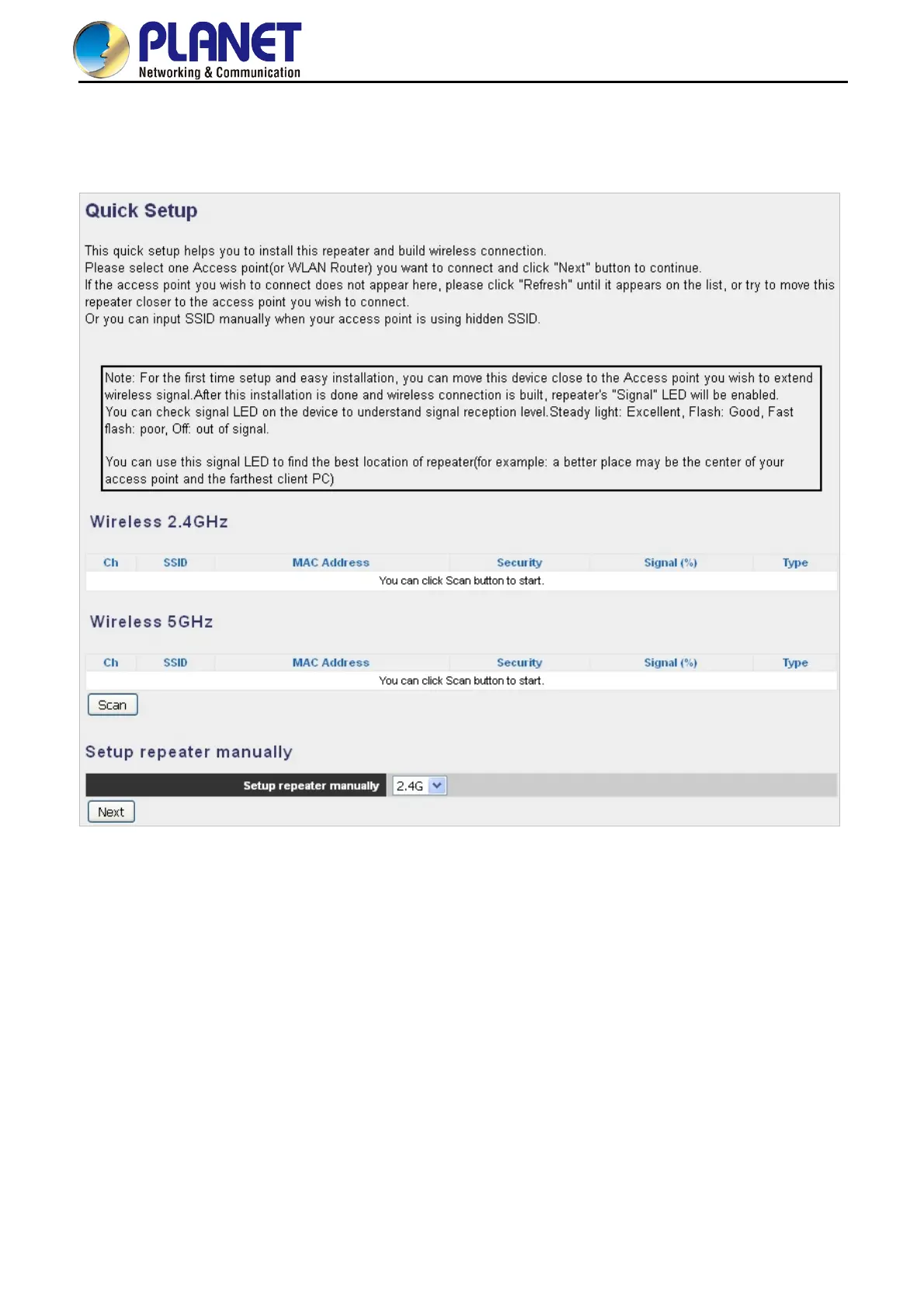 Planet WRE-1200 - Client Mode Advanced Settings; Scanning Wireless Signal; Figure 7-1 Quick Setup